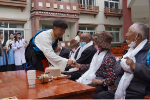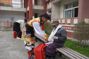 接着,我院文艺部成员为老人献上了一场富有思想性、娱乐性、艺术性的文艺表演,整个表演活动受到老人们的喜爱和肯定,演出结束后,实践团成员为米林县特困集中供养服务中心的老人们一一赠送慰问品并握手相互问候以表谢意。