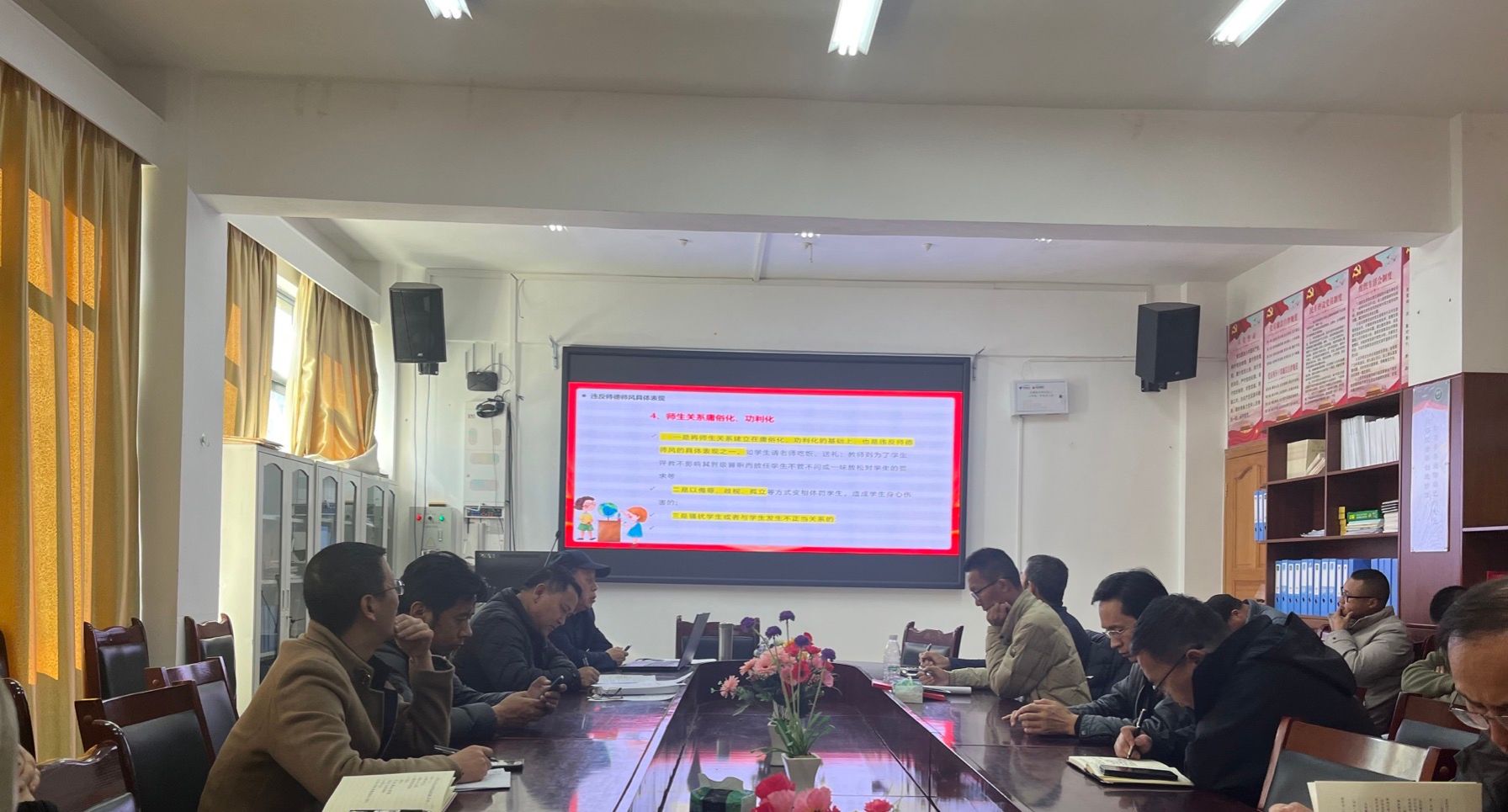 随后,他指出了违反师德师风的具体表现,如爱岗敬业精神弱化,部分教师对教学工作缺乏热情和投入;价值取向功利化、世俗化,过于追求个人利益;行为规范不严,师表形象模糊化,不能给学生树立良好的榜样;师生关系庸俗化、功利化,背离了教育的本质。