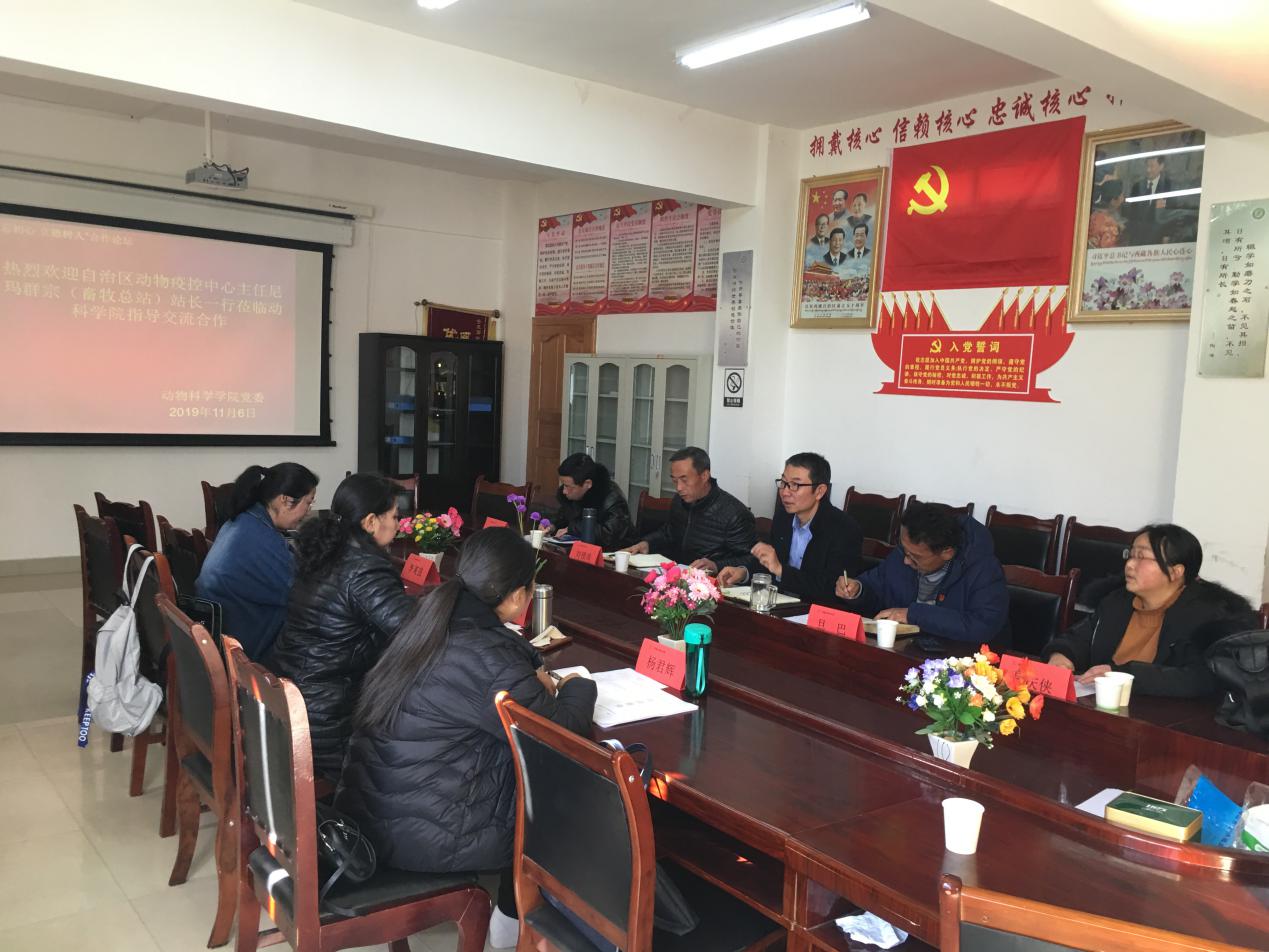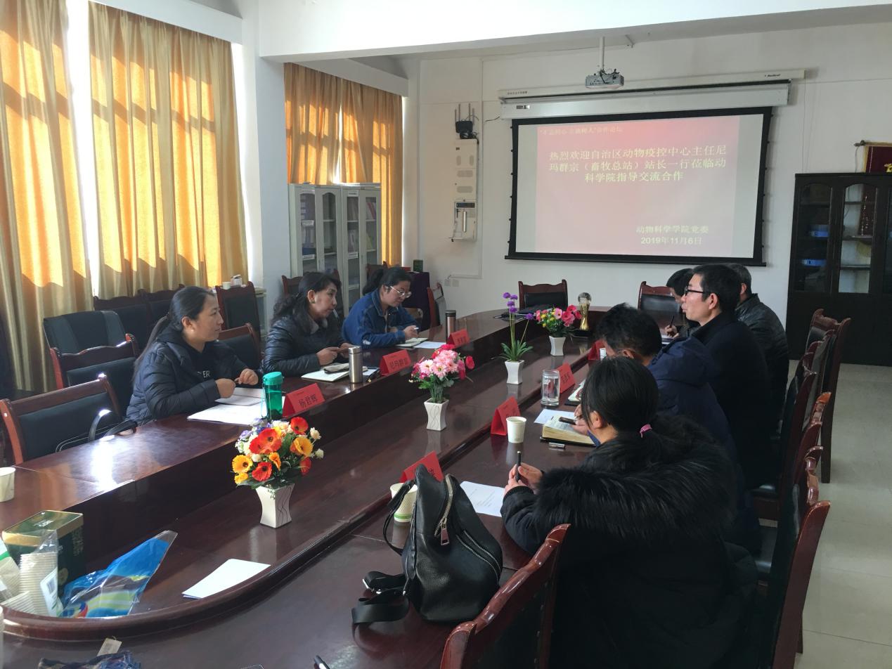 为进一步贯彻落实“不忘初心,牢记使命”主题教育活动,动物科学学院领导班子在前期主题教育活动调研基础上,找差距,抓落实,为进一步加强我院与西藏自治区动物疫病预防控制中心的交流,强化我院学生实践动手能力,提高我院本科生、研究生的培养质量,加深我院与自治区动物疫控中心在畜牧、兽医、草业学科领域科研合作关系。2019年11月6日西藏自治区动物疫病预防控制中心(畜牧总站)尼玛群宗站长一行莅临西藏农牧学院动物科学学院进行了座谈会议。动物科学学院出席会议领导有苗彦军书记、旦巴副书记、刘锁柱副院长及各教研室主任,会议由刘锁珠副院长主持。