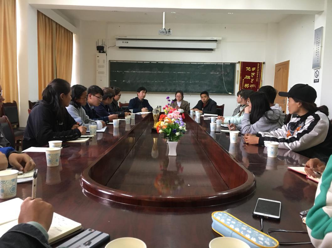 动物科学学院2017-2018-2学期关于学习交流的学生座谈会于2018年4月27日下午17点20在动科院三楼会议室召开,参会的人员有全院的班级学习委员及学生代表、孙磊副院长、顿珠多吉和叶幼荣,会议由主管教学的孙磊副院长主持。