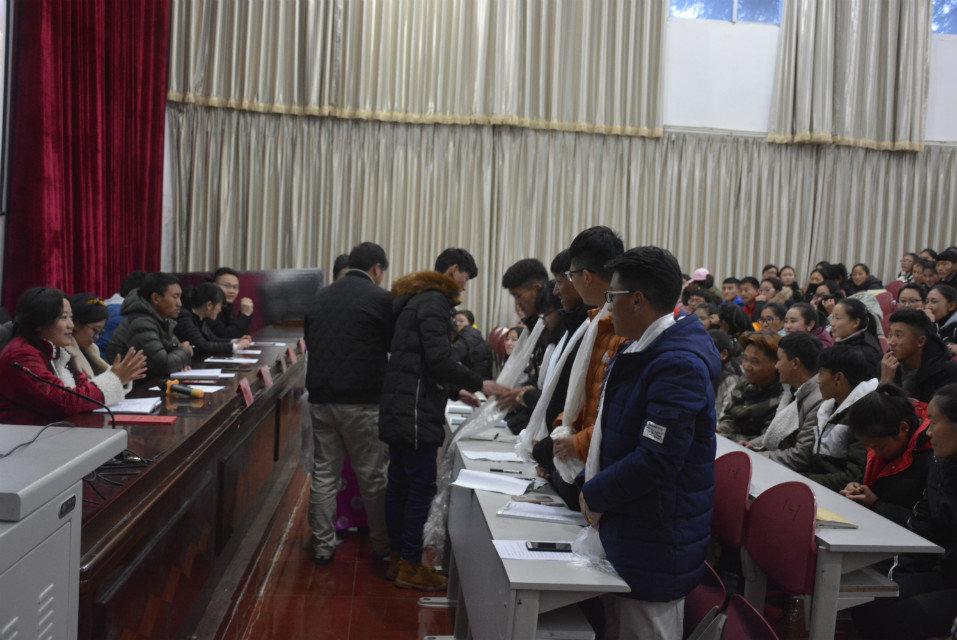 随后,大会进入换届阶段,团总支书记姚梦婕宣读了新一届团总支学生会负责人名单,并诚邀出席领导对新一届团总支学生会各负责人颁发任职聘书,会场响起经久不息的掌声,给上一届团总支学生会老成员给予深深的感谢并鼓励新一届成员传承优良精神,继续发扬优点。接着常务副书记达瓦桑杰做了下一步工作安排及工作展望并相互递交了院旗。新一届团总支学生会常务副书记及主席给上一届团总支学生会老成员献上洁白的哈达,感谢他们对工作的兢兢业业和对新一届成员的培养付出心血。