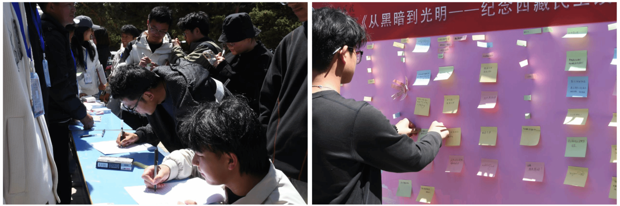 “铭记与传承”西藏民主改革66周年纪念活动。我院于3月28日13:00在一食堂门前开展纪念活动,本次活动通过历史讲解、互动留言问答及纪念品分发三个环节展开。工作人员组织师生参观西藏民主改革历史展板,参与便利贴祝福粘贴和现场问答,深化对历史与文化的理解;最后由工作人员分发纪念奖品,激发参与者热情,传递民族团结信念。