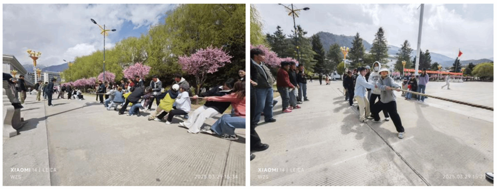 “同心同行,雪域新生”主题拔河比赛。3月28日学院学生会在文体馆前组织开展拔河比赛,本次比赛以体育竞技形式致敬历史,展现新时代青年团结协作、拼搏进取的精神风貌,致敬农奴解放历史,凝聚奋进力量。本次比赛有14个班级参加比赛,其中男生组冠军为农业水利工程2022级本科班,女生组冠军为工程管理2023级本科班。拔河活动深化了同学们对“坚韧不拔、众志成城”精神的理解,将体育精神与“老西藏精神”结合,激发青年担当。