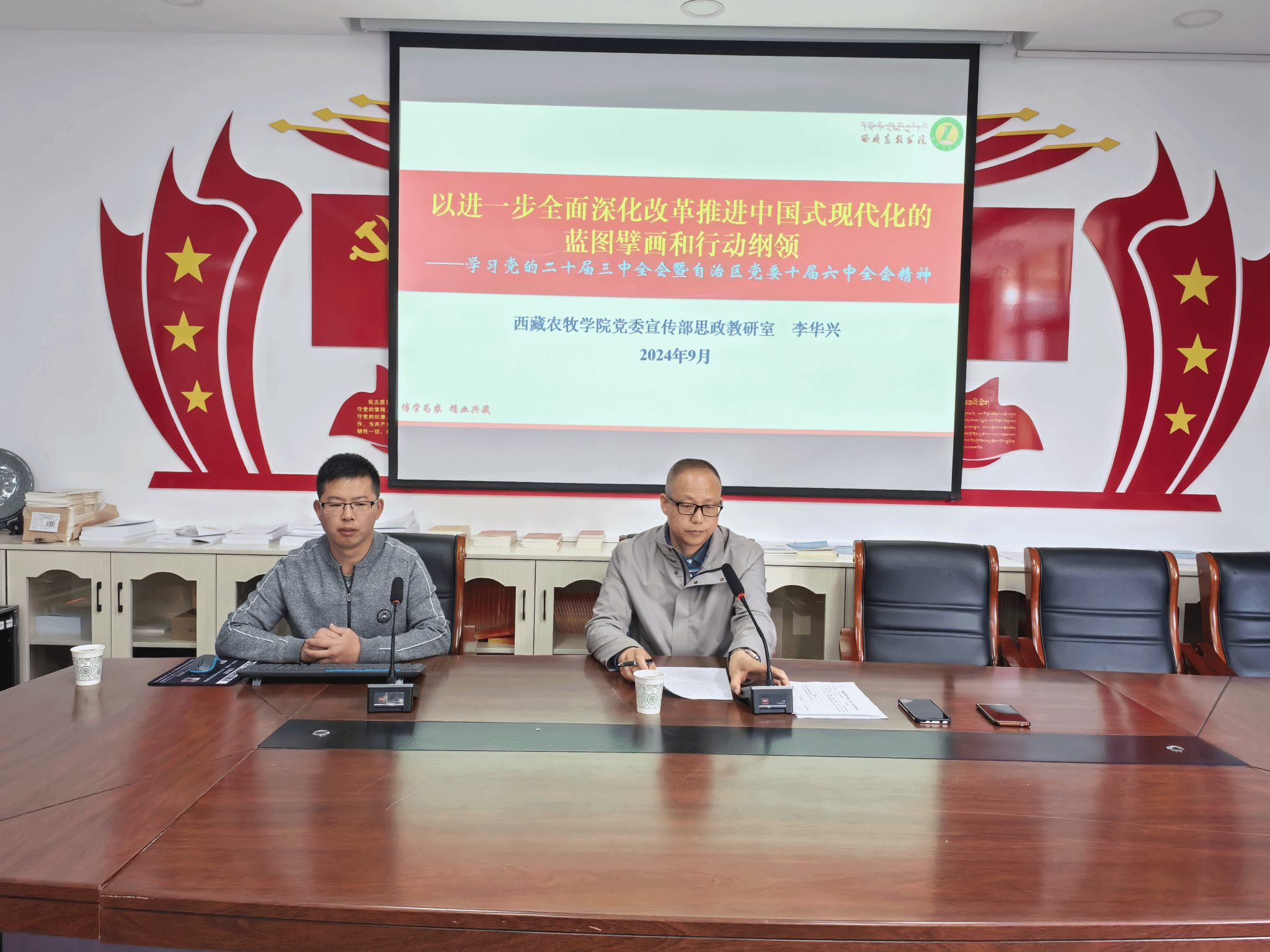 9月20日下午,资源与环境学院组织开展党的二十届三中全会和自治区党委十届六次全会精神宣讲学习活动。西藏农牧学院党委宣传部、思想政治教研室副教授李华兴受邀作专题宣讲报告。资源与环境学院院长孙自保主持报告会。资源与环境学院全体无课教职工共40余人参加宣讲报告会。