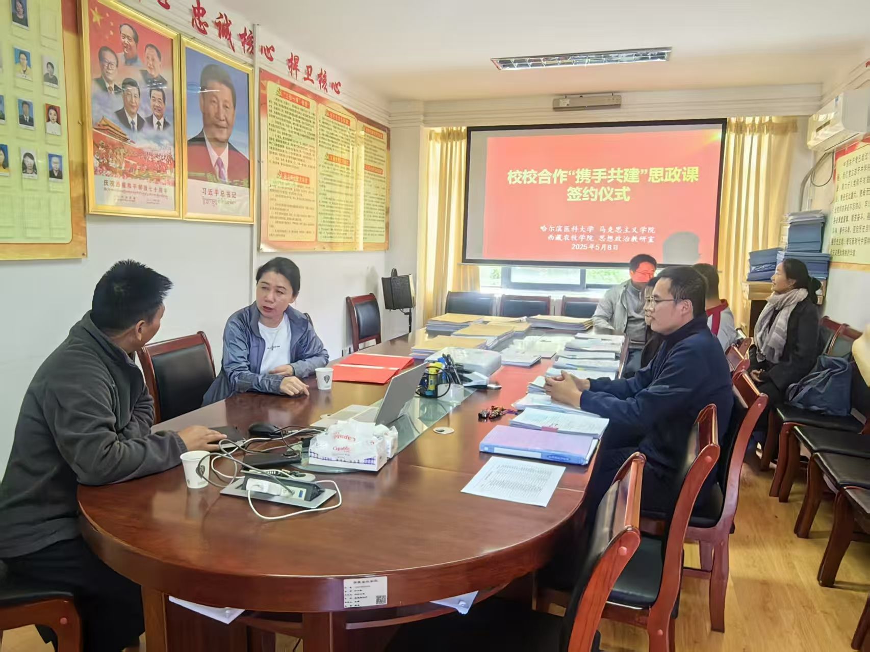 签约仪式前,李中华院长介绍了哈尔滨医科大学马克思主义学院的办学历史,听取了欧博思政课教师在授课过程中遇到的困难和疑惑,并向与会教师进行了解答,还分享了自己在教学中的经验和感悟。达娃次仁介绍了欧博思政课建设基本情况,表示将以此次合作共建为契机,在思政课标准化建设、思政课教师队伍建设、科研项目申报、深化教学改革、集体备课等方面开展深入交流,加强共建合作,加快构建思政课建设新格局。期望哈尔滨医科大学马克思主义学院充分发挥示范引领作用,通过对口指导、实地指导、业务讲座、双方骨干教师交流等形式协助欧博优化和培养思政课教师,提高教学水平、改进教学方法、提升欧博师资队伍的整体工作能力,帮助欧博结对建好思政课。