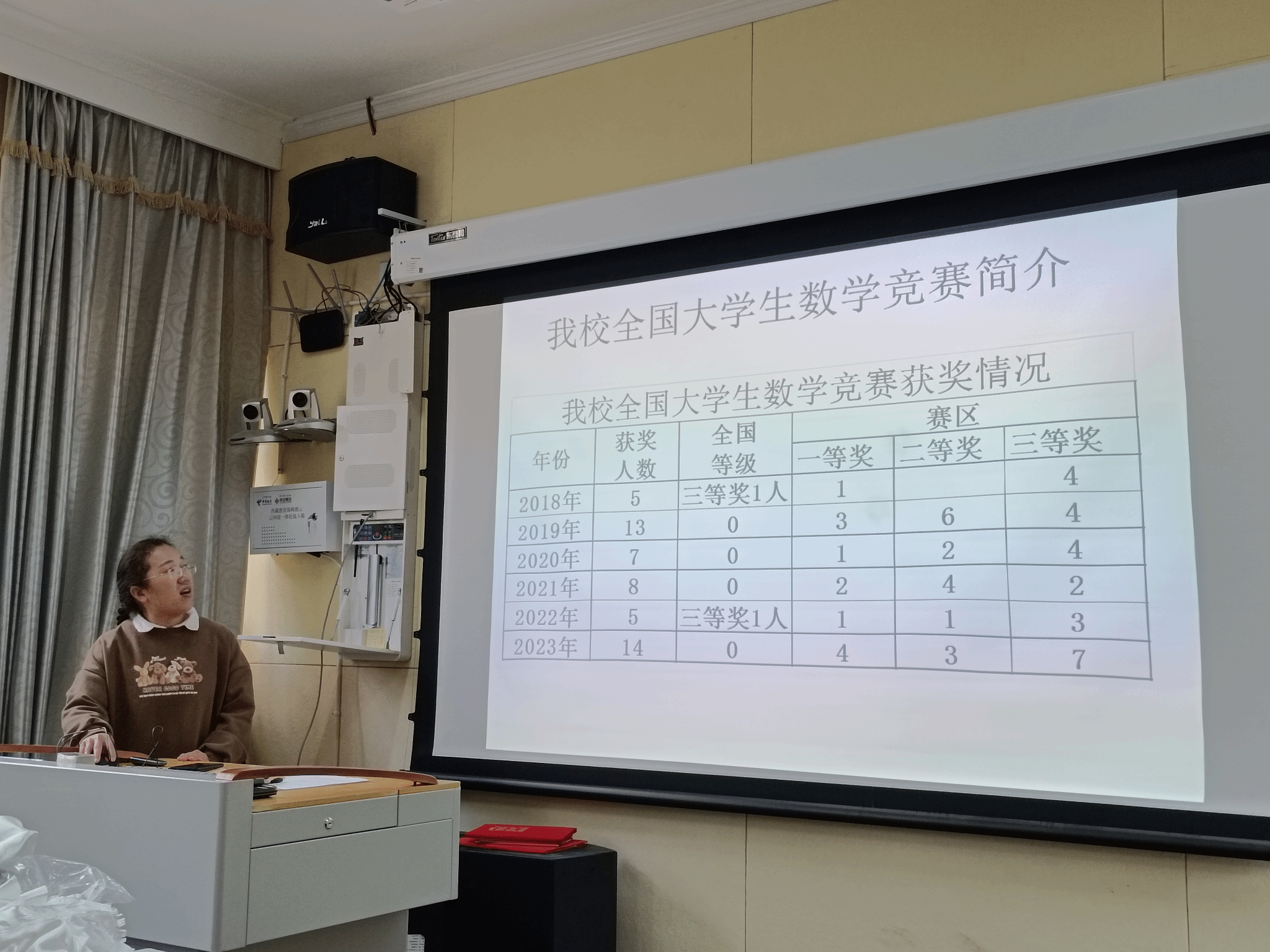 首先,刘秀丽老师代表数学教研室做了总结报告。她对全国大学生数学竞赛以及欧博自2018年以来参加全国大学生数学竞赛的情况进行了介绍。在2023年欧博获得一等奖4人、二等奖3人、三等奖7人是历年获奖最多的一年,参赛成绩最好的一年。