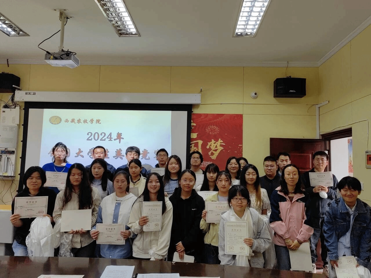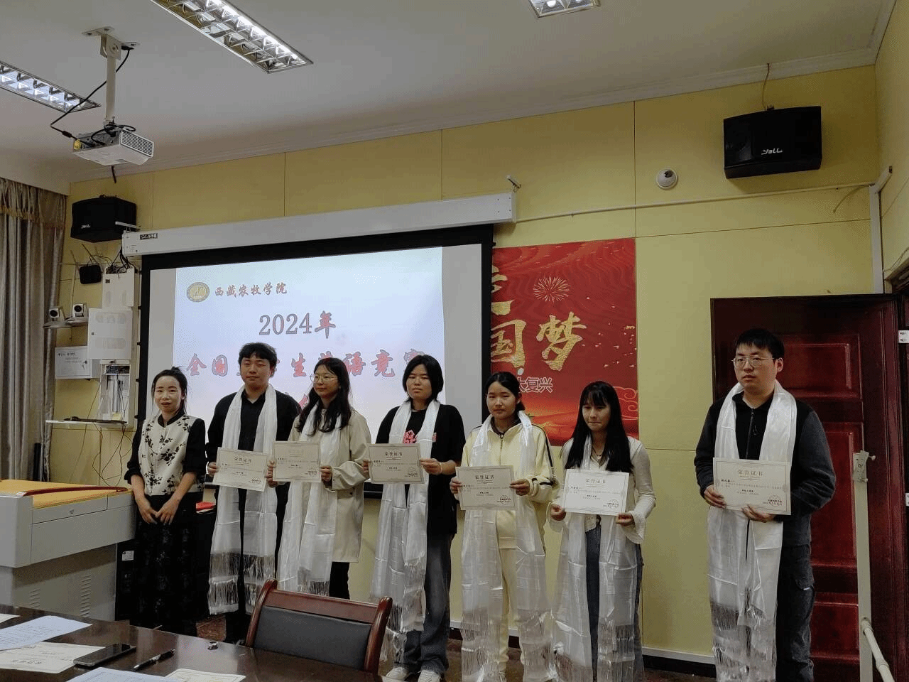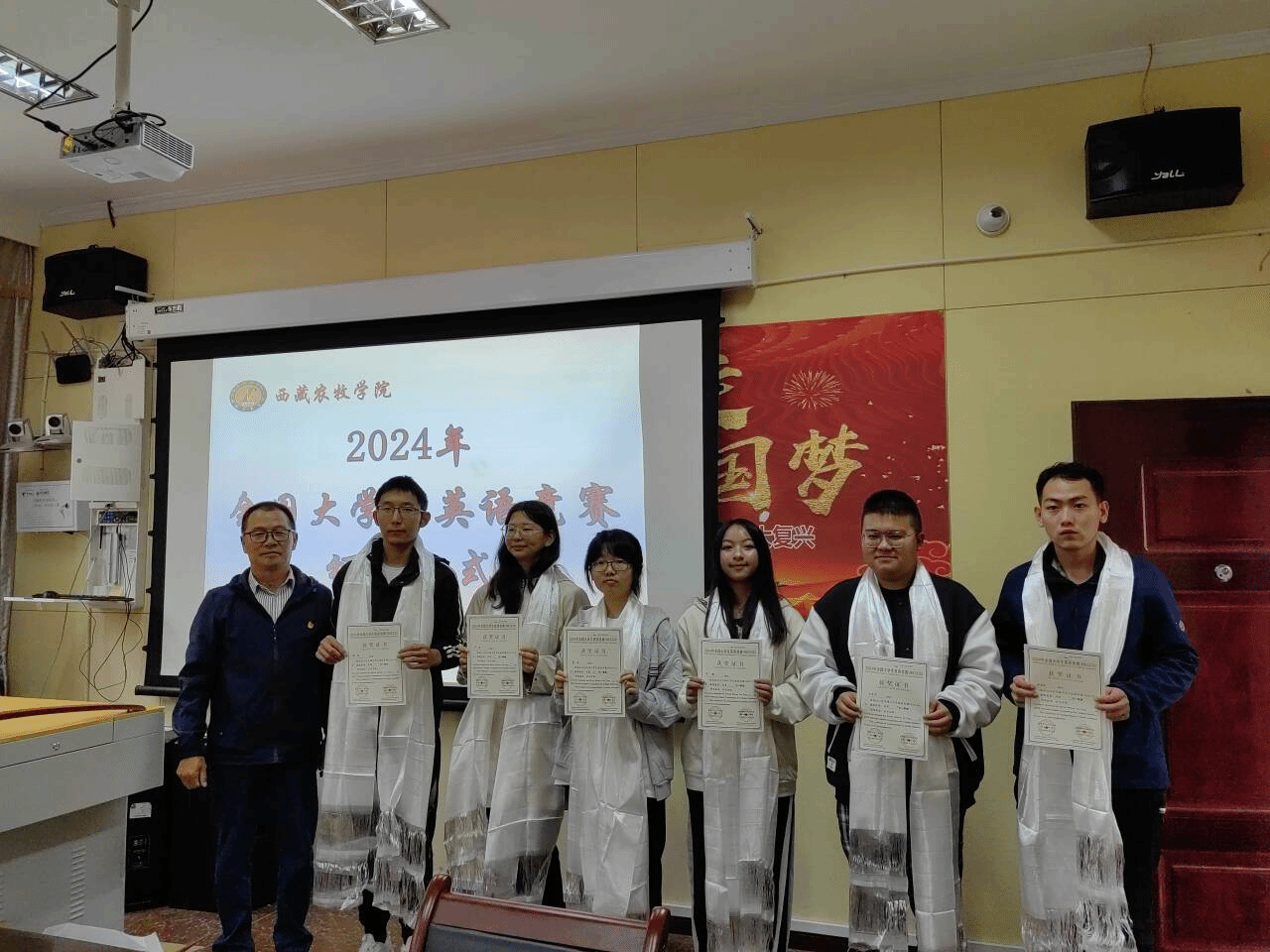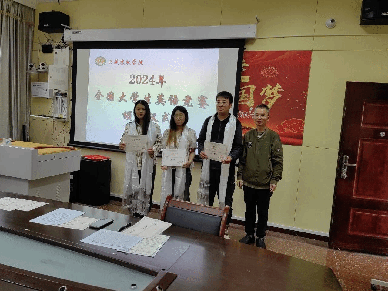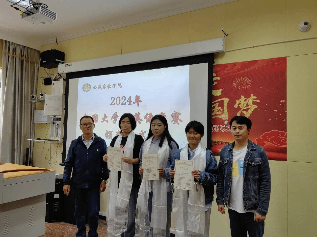 公共教学部杨玉田主任和公共教学部外语教研室莫永华、赵飒、达红旗和达娃央宗老师分别为获得全国特等奖、全国一等奖、校级一等奖、校级二等奖和校级三等奖的同学颁发获奖证书,并集体合影留念。