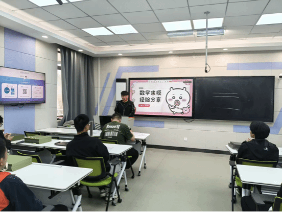 随后,通过线下线上混合式开展了2025年中国研究生数学建模竞赛宣讲会。首先,邀请了获得24年全国三等奖的刘世博同学分享参赛经验。他从组队、学习方式、学习内容开始讲起,然后结合他选择的“高速公路应急车道紧急启用模型”赛题进行了讲解,讲到自己如何将工程中的流体力学运用到建模中,也讲到了比赛过程中团队协作的重要性以及科学掌控比赛时间的关键性。最后,他建议大家要合理规划研究生生活,多参加学科竞赛,竞赛不等于考试,在竞赛中可以学到很多课程中没有学到的知识,可以锻炼自己解决问题的思维,提高解决问题的能力。