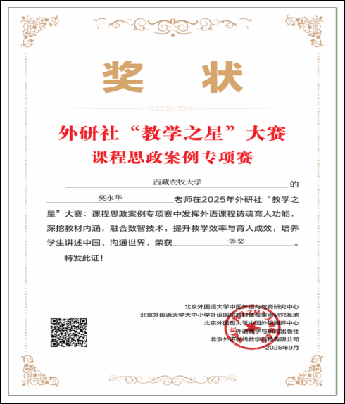近日,马克思主义学院(公共教学部)外语教研室莫永华老师在2025年外研社“教学之星”大赛课程思政案例专项赛中荣获一等奖,展现了我校在外语教学与课程思政融合方面的突出成果。