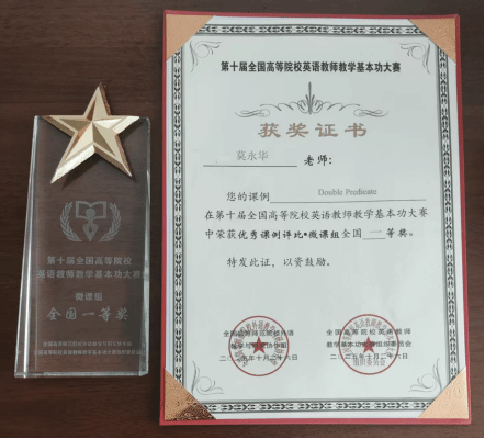 2025年全国高等院校英语教学学术年会暨第十届全国高等院校英语教师教学基本功大赛于2025年10月23日—26日在江苏省南京市南京理工大学外国语学院顺利召开。我院(部)外语教研室教师莫永华以优异表现,获得微课组全国一等奖。