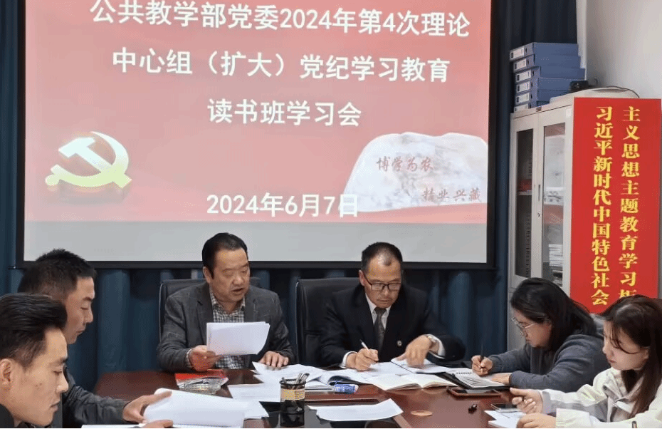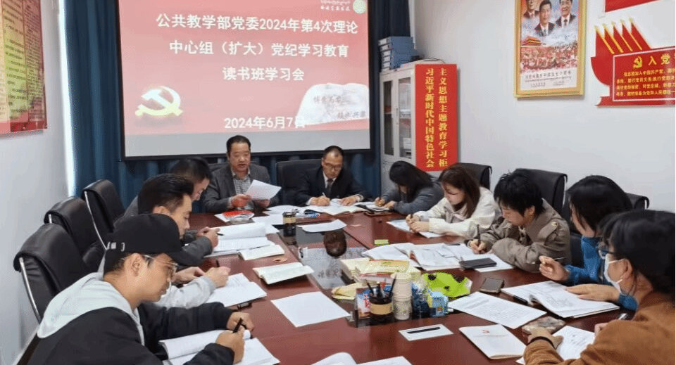 2024年6月7日上午,公共教学部组织召开党委2024年第4次理论中心组(扩大)党纪学习教育读书班学习会,会议由部党委书记衡思泉主持,部班子成员、各党支部书记、支部委员参加了学习会。