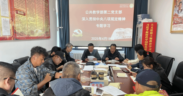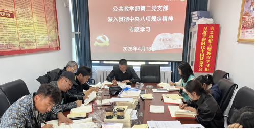为深入学习贯彻习近平总书记关于加强党的作风建设的重要论述,坚定不移贯彻落实中央八项规定精神,公共教学部教工第二党支部于4月18日在部党支部活动室召开深入贯彻中央八项规定精神学习教育专题学习会,会议由支部书记刘西锋主持。全体党员参加,部党委书记衡思泉以普通党员的身份参加了学习会。