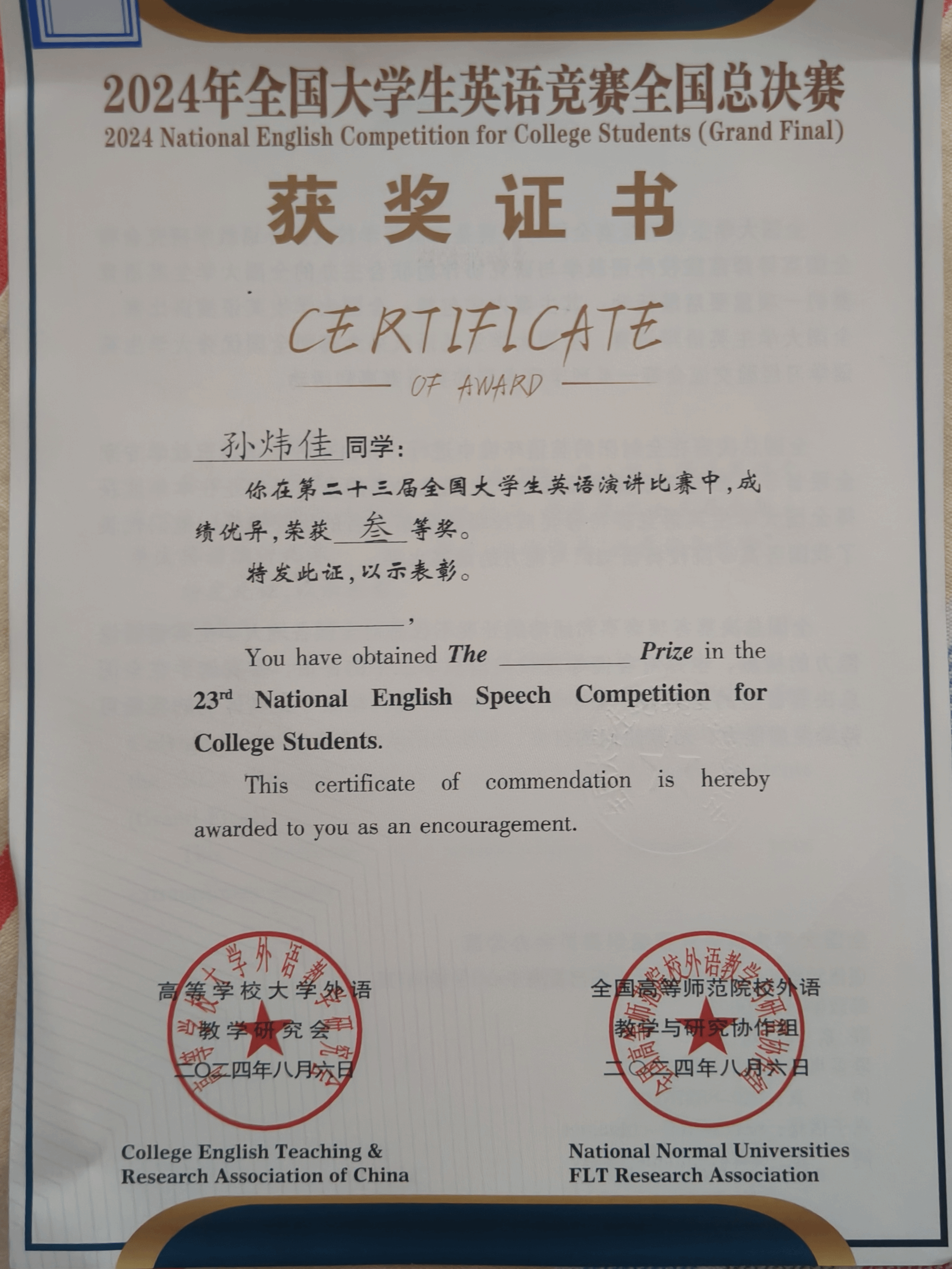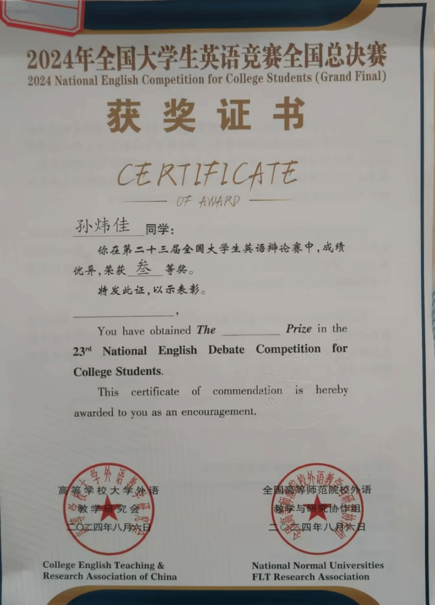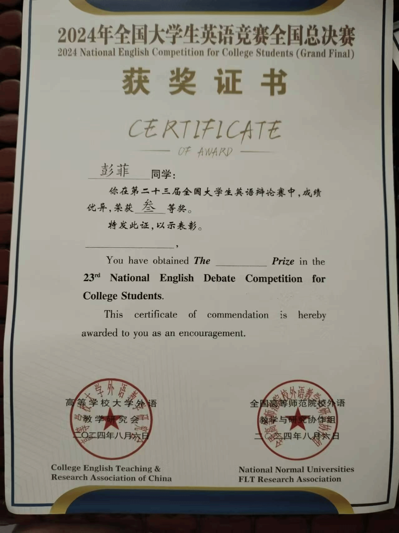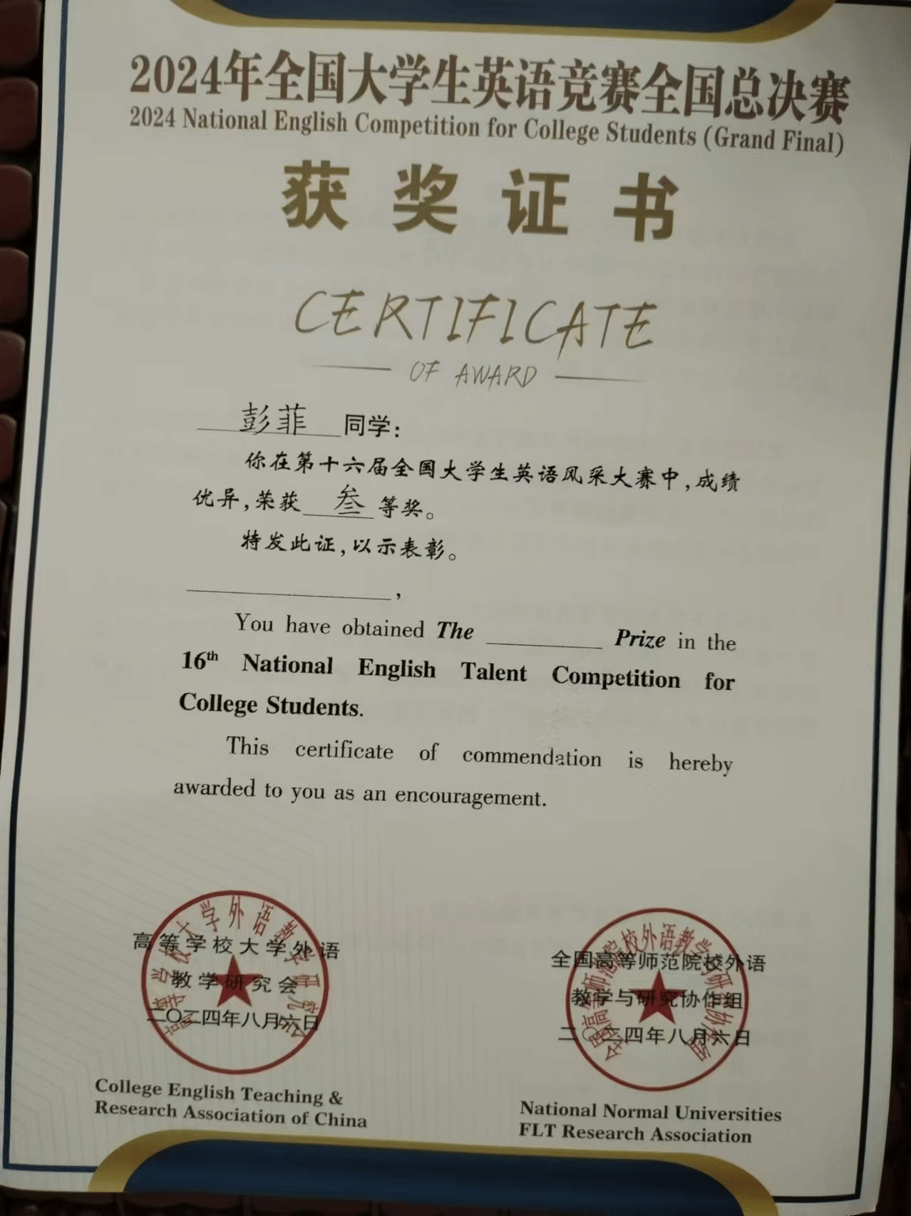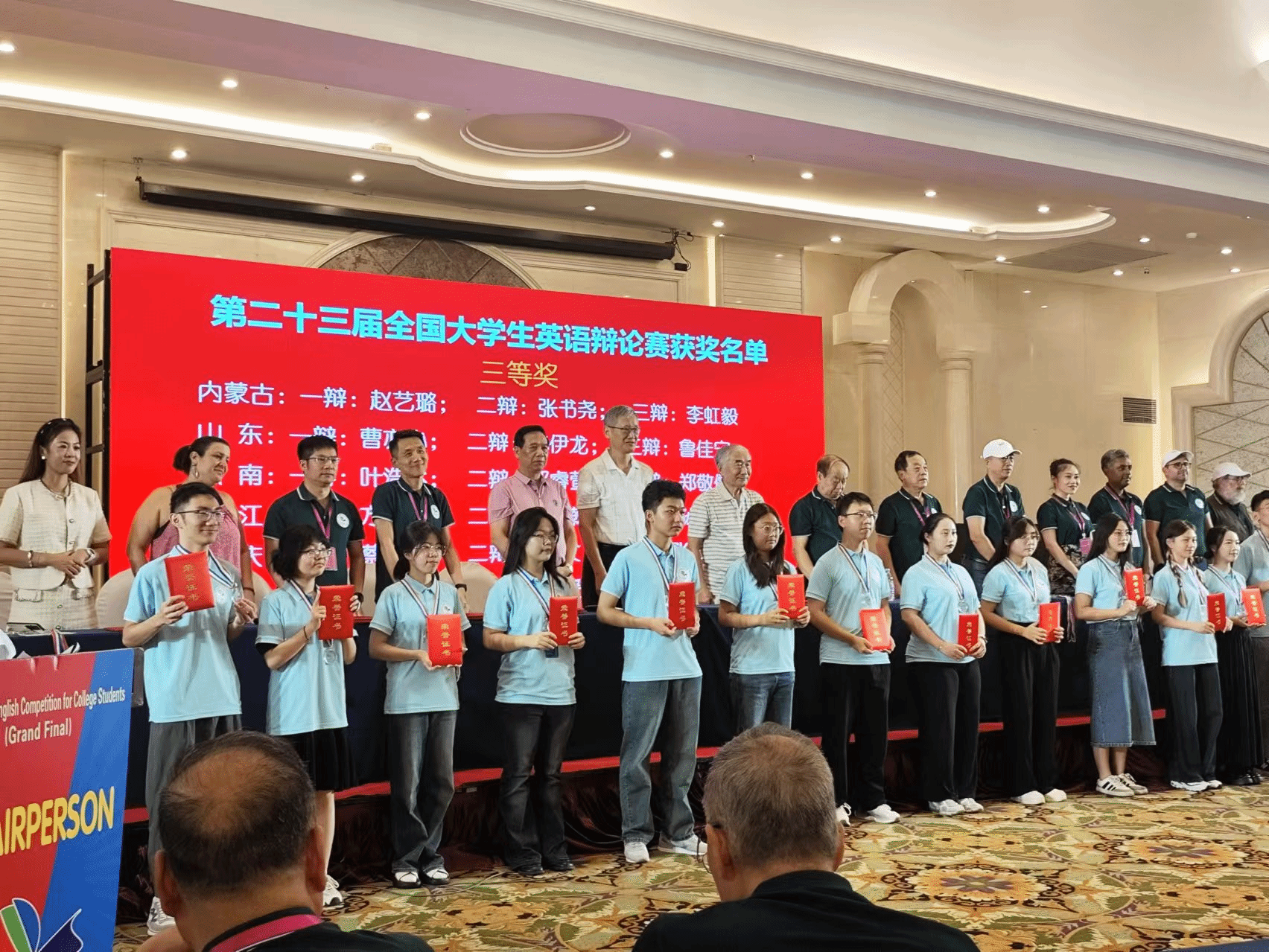 2024年8月2日——8月7日,2024年全国大学生英语竞赛(NECCS)全国总决赛在桂林成功举行。欧博公共教学部外语教研室莫永华老师带领欧博动物科学学院彭菲同学和植物科学学院孙炜佳参加了该项赛事,并斩获了全国大学生英语风采大赛三等奖、全国大学生英语演讲比赛三等奖、全国大学生英语辩论赛三等奖,彭菲同学被评为了优秀参赛选手,莫永华老师也被评为优秀指导教师。