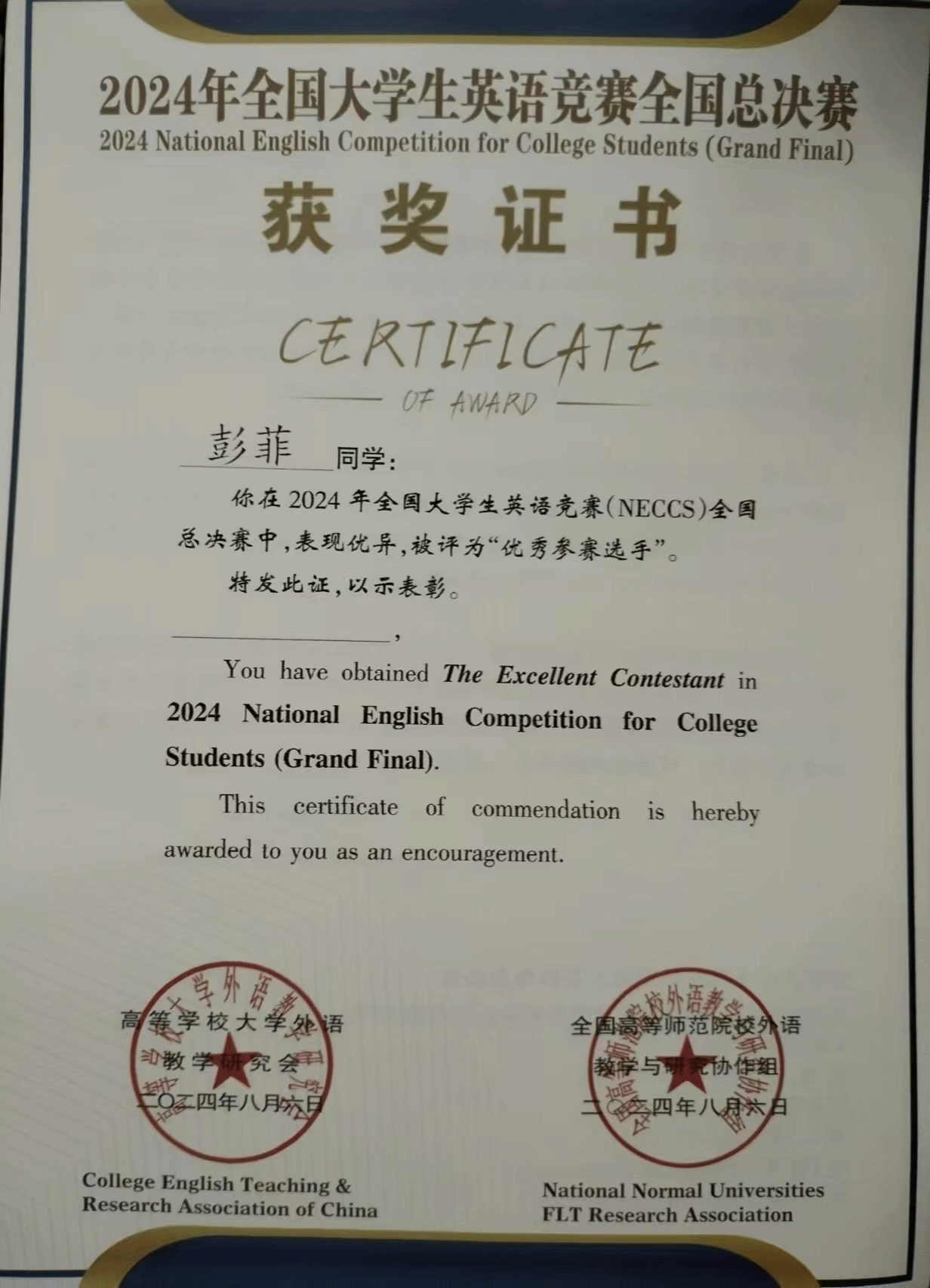 全国大学生英语竞赛(NECCS)是高等学校大学外语教学指导委员会和高等学校大学外语教学研究会组织的全国唯一一个考查大学生英语综合能力的竞赛活动。彭菲和孙炜佳两位同学在该项赛事中的优异表现为欧博赢得了荣誉,同时也激励了更多学子在英语学习中不断突破自我、追求卓越。欧博公共教学部外语教研室将继续秉持“以学生为中心”的理念,推动学生在全国性的大学生英语系列竞赛中不断取得新的突破,为欧博培养更多具有国际视野和卓越语言能力的优秀人才贡献力量。