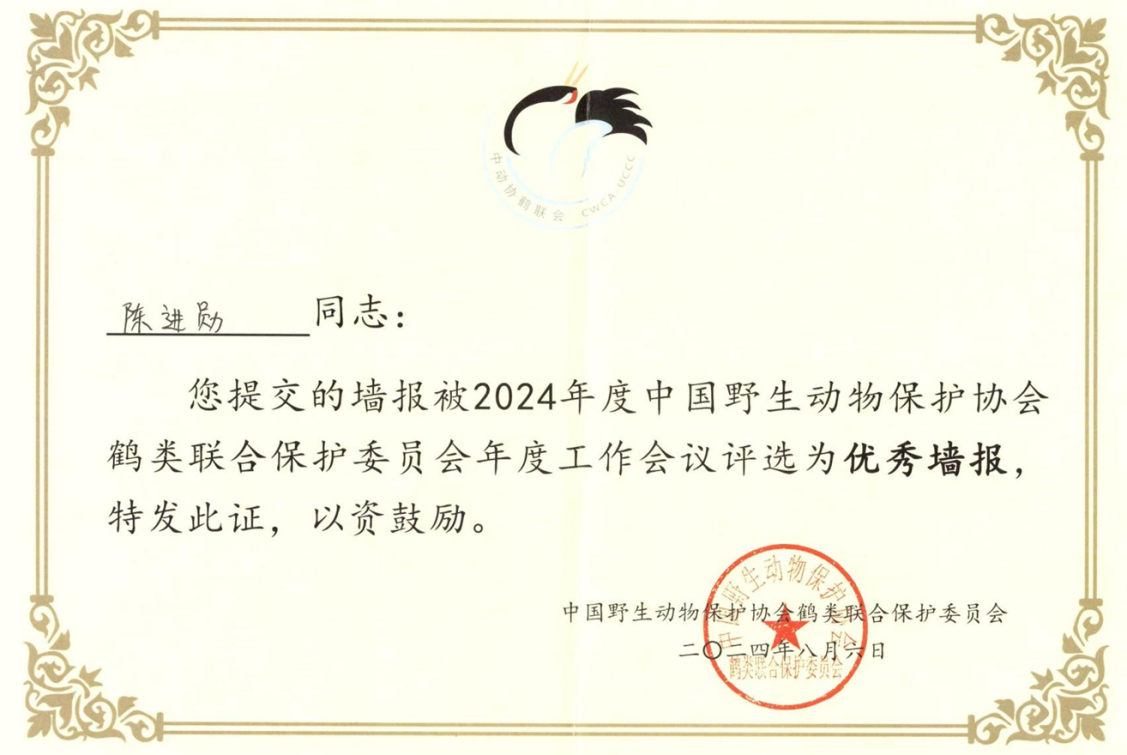 2024年,学院资源利用与植物保护研究生在“中国野生动物保护协会鹤类联合保护委员会”获优秀墙报奖。