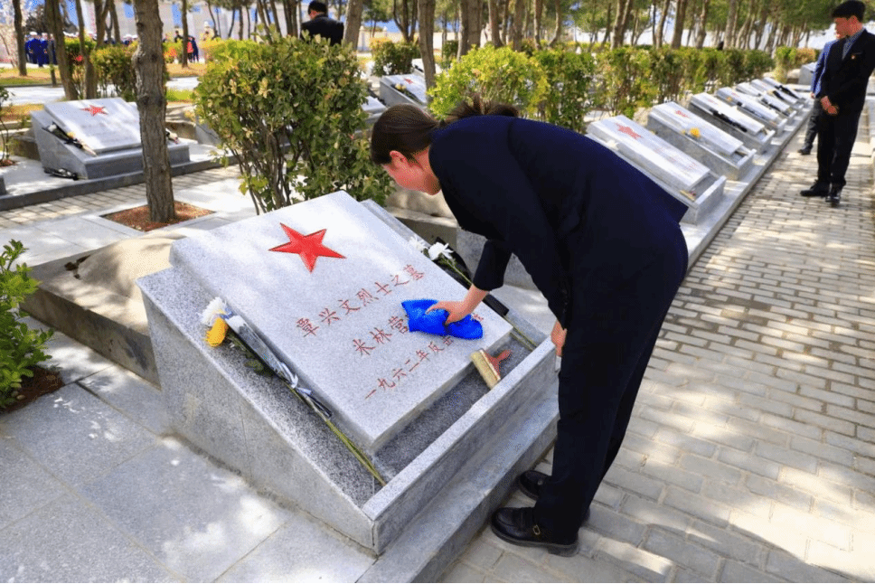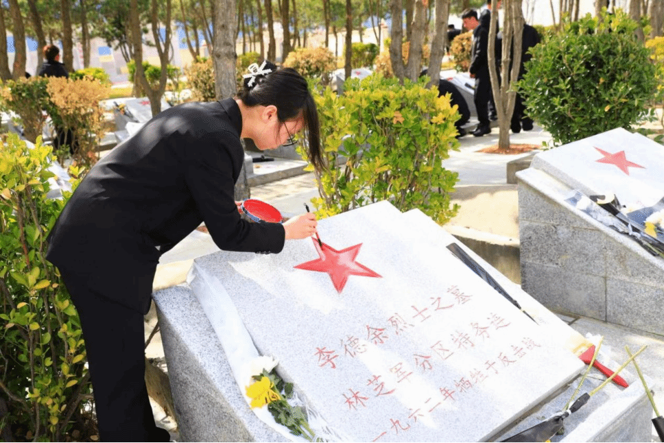 一草一木一忠魂,一山一石一丰碑。潘多副书记宣读祭文后,同学们依次向烈士纪念碑献上淡白色菊花,瞻仰英雄的事迹,追忆革命先辈丰功伟绩;在烈士纪念碑前,党员们重温入党誓词,声音响亮,震彻天地,不忘入党初心,锤炼党性,坚定信念再前进;在一座座烈士墓碑前,同学们驻步停留,擦拭墓碑上岁月的痕迹,在烈士姓名上深深的描红,用手轻轻地抚摸着墓碑,向先烈致以深切哀思。