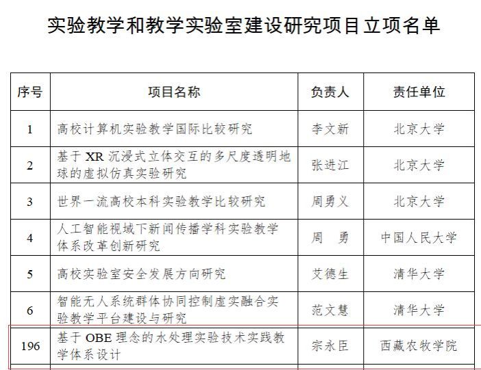 近日,教育部高等教育司发布了关于公布实验教学和教学实验室建设研究项目立项名单的通知,此次全国共批准234项,西藏自治区共计获批4项。由宗永臣教授作为负责人申报的“基于OBE理念的水处理实验技术实践教学体系设计”获得立项。