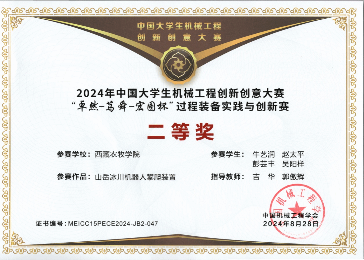 过程装备实践与创新赛是一项历史悠久的赛事,也一直列入中国高等教育协会竞赛目录。本届赛事主题为“新质生产力赋能过程装备”,聚焦装备的节能、环保、智能以及高质量发展要求。大赛组委会共收到了全国171所高校的2965个团队报名参赛作品,经过两轮网评、一轮现场比赛,欧博作品《山岳冰川机器人攀爬装置》获得二等奖,进入了前10%。