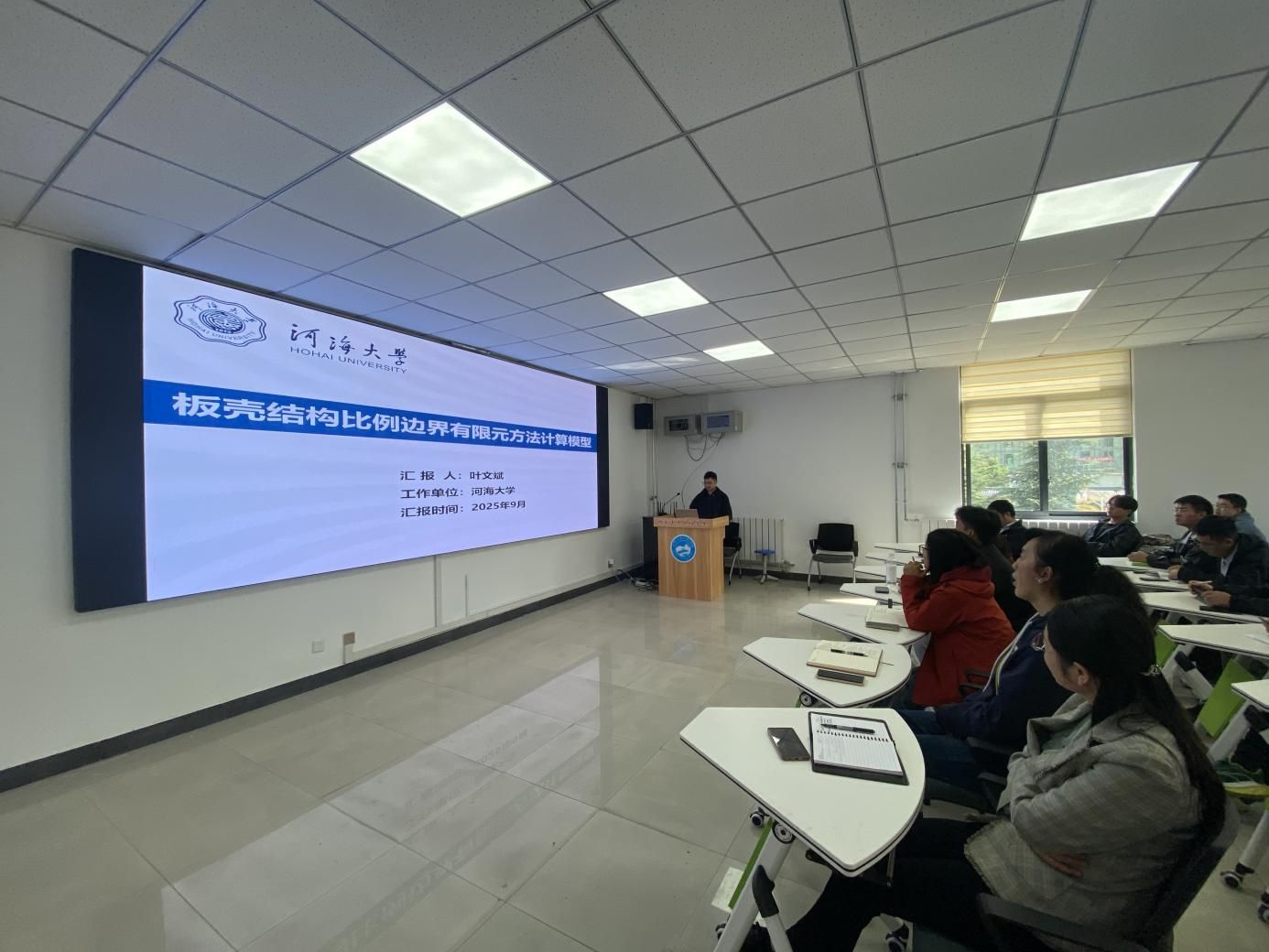 会上,大连理工大学刘俊教授与河海大学叶文斌博士分别以“流固耦合与渗流分析的高效能数值方法研究”“板壳结构比例边界有限元方法计算模型”为题,做了专题学术报告。刘俊教授的报告从水利工程事故案例切入,深入分析了流固耦合作用机制与数值模拟的关键技术挑战,系统介绍了其团队在高性能计算方法领域的最新成果,为复杂工程条件下的渗流安全评估提供了新思路。叶文斌博士的报告分享了“板壳结构比例边界有限元方法计算模型”的研究工作,从理论背景、模型构建和算法实现等方面,阐述了该方法计算效率与精度优势,特别是在处理奇异性和复杂边界条件问题时的应用潜力,为结构数值仿真提供了有力工具。