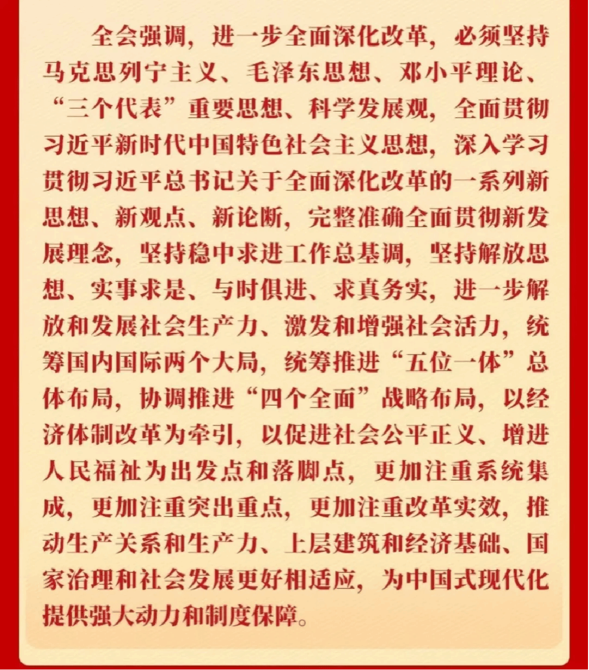 全会强调,进一步全面深化改革,必须坚持马克思列宁主义、毛泽东思想、邓小平理论、“三个代表”重要思想、科学发展观,全面贯彻习近平新时代中国特色社会主义思想,深入学习贯彻习近平总书记关于全面深化改革的一系列新思想、新观点、新论断,完整准确全面贯彻新发展理念,坚持稳中求进工作总基调,坚持解放思想、实事求是、与时俱进、求真务实,进一步解放和发展社会生产力、激发和增强社会活力,统筹国内国际两个大局,统筹推进“五位一体”总体布局,协调推进“四个全面”战略布局,以经济体制改革为牵引,以促进社会公平正义、增进人民福祉为出发点和落脚点,更加注重系统集成,更加注重突出重点,更加注重改革实效,推动生产关系和生产力、上层建筑和经济基础、国家治理和社会发展更好相适应,为中国式现代化提供强大动力和制度保障。