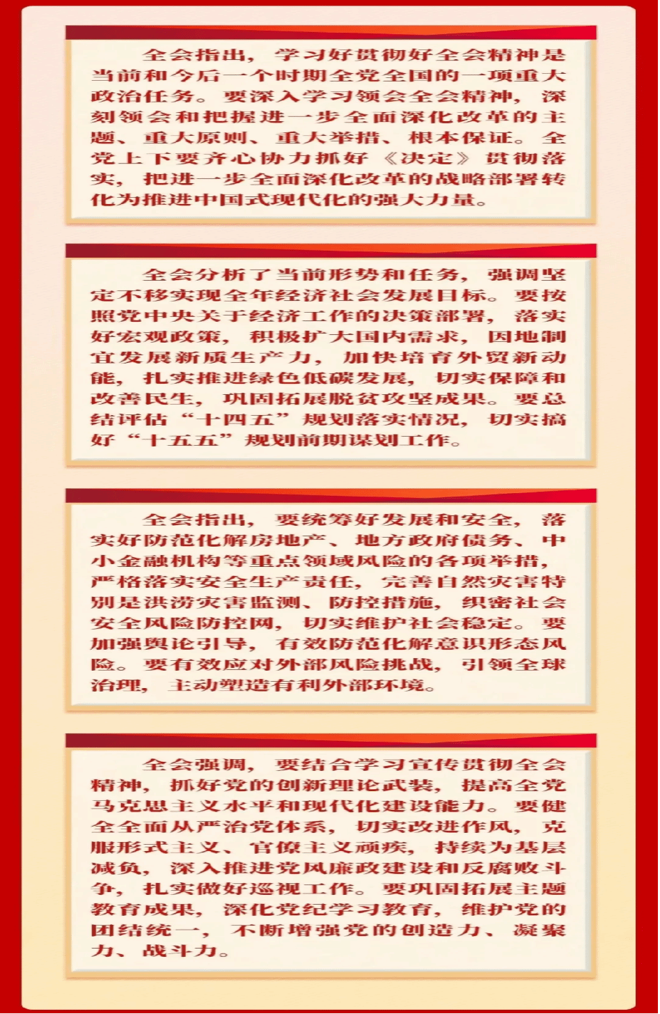 全会指出,要统筹好发展和安全,落实好防范化解房地产、地方政府债务、中小金融机构等重点领域风险的各项举措,严格落实安全生产责任,完善自然灾害特别是洪涝灾害监测、防控措施,织密社会安全风险防控网,切实维护社会稳定。要加强舆论引导,有效防范化解意识形态风险。要有效应对外部风险挑战,引领全球治理,主动塑造有利外部环境。