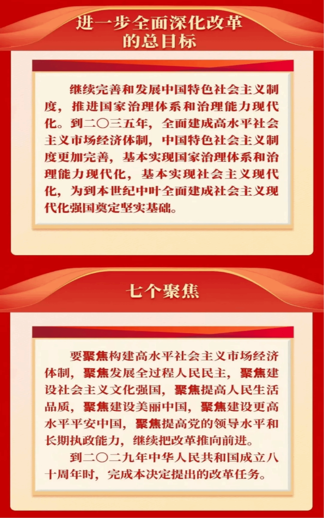 全会指出,进一步全面深化改革的总目标是继续完善和发展中国特色社会主义制度,推进国家治理体系和治理能力现代化。到二〇三五年,全面建成高水平社会主义市场经济体制,中国特色社会主义制度更加完善,基本实现国家治理体系和治理能力现代化,基本实现社会主义现代化,为到本世纪中叶全面建成社会主义现代化强国奠定坚实基础。要聚焦构建高水平社会主义市场经济体制,聚焦发展全过程人民民主,聚焦建设社会主义文化强国,聚焦提高人民生活品质,聚焦建设美丽中国,聚焦建设更高水平平安中国,聚焦提高党的领导水平和长期执政能力,继续把改革推向前进。到二〇二九年中华人民共和国成立八十周年时,完成本决定提出的改革任务。