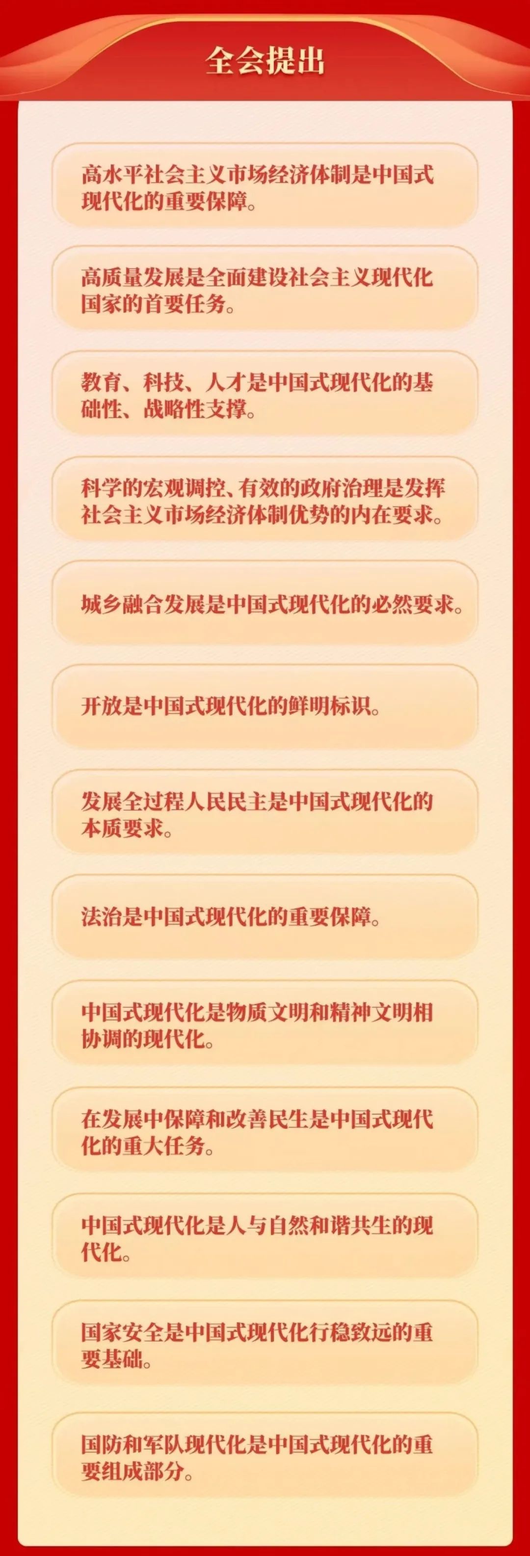 全会对进一步全面深化改革做出系统部署,强调构建高水平社会主义市场经济体制,健全推动经济高质量发展体制机制,构建支持全面创新体制机制,健全宏观经济治理体系,完善城乡融合发展体制机制,完善高水平对外开放体制机制,健全全过程人民民主制度体系,完善中国特色社会主义法治体系,深化文化体制机制改革,健全保障和改善民生制度体系,深化生态文明体制改革,推进国家安全体系和能力现代化,持续深化国防和军队改革,提高党对进一步全面深化改革、推进中国式现代化的领导水平。