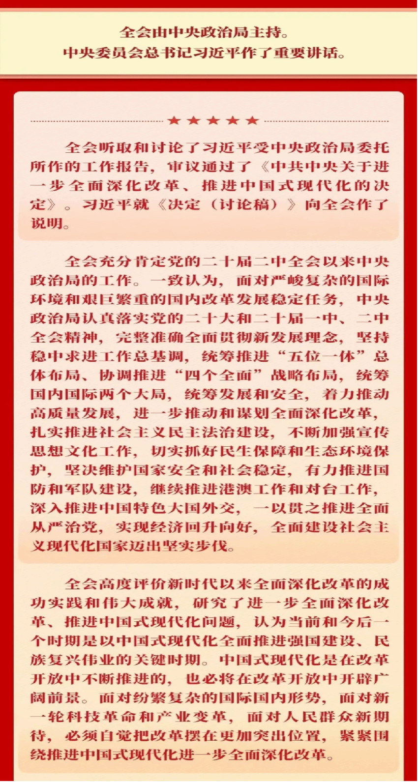 全会听取和讨论了习近平受中央政治局委托所作的工作报告,审议通过了《中共中央关于进一步全面深化改革、推进中国式现代化的决定》。习近平就《决定(讨论稿)》向全会作了说明。