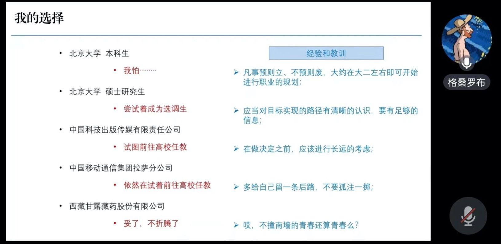 为了激励更多的大学生投身创新创业,进一步做好学生生涯规划指导,21生技本科1、2班于5月7日下午15:30,在禄亚洲老师的组织安排下,通过腾讯线上会议的方式,邀请了西藏甘医药技术有限公司的执行董事、总经理格桑罗布老师带来了一场精彩、有深度的讲座。
