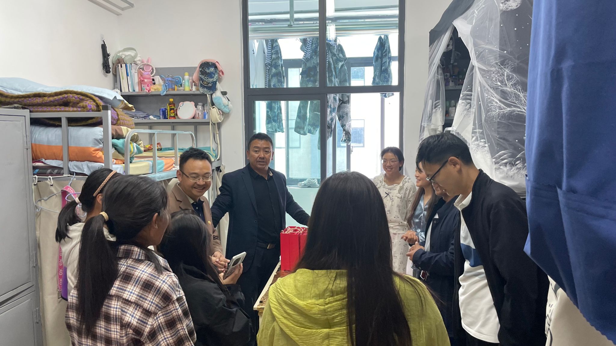 在慰问活动中,索朗才旺一行深入新生宿舍,与新生们亲切交谈,了解他们在校的生活状况和初到高原的适应情况。索朗才旺表示,高原气候特殊,同学们如有任何不适和异常要及时向学院反映;在宿舍同学们之间要友好相处,共同营造和谐美好的宿舍氛围;此外,为宿舍的每位新生送上中秋礼物和诚挚的祝福,使新生们感受到了学院的温暖。