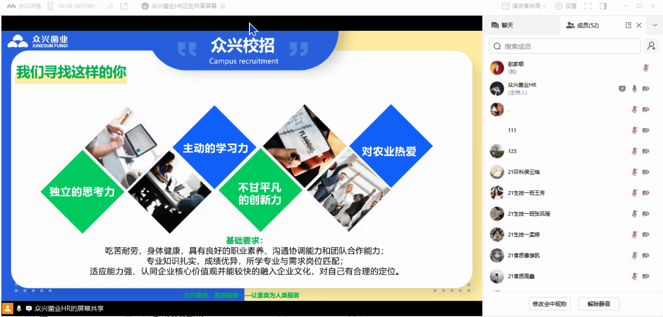 为进一步拓宽学生就业渠道,加强校企合作,4月1日食品科学学院举办甘肃天水众兴菌业线上校招专题宣讲会。食品质量与安全、食品科学与工程、生物技术三个专业的45名学生参与此次宣讲会。