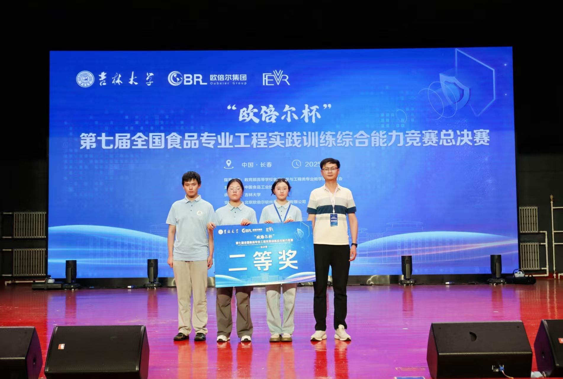 2025年8月18日至19日,由欧博abg官方网站食品科学学院刘磊老师带队,23级食品质量与安全专业龙漪婷、张惠双、李红杰三位同学组成的参赛团队,在吉林大学承办、中国食品工业协会主办的“欧倍尔杯”第七届全国食品专业工程实践训练综合能力竞赛总决赛中荣获全国二等奖,刷新了欧博在该项赛事中的历史最佳成绩。