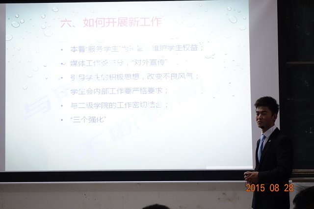 为保障我院学生会各项工作的连续性,进一步加强学生会组织建设,充分发挥学生会的各项职能,更好的服务学生, 8月28日15:30,学生会进行了新一届主席团换届竞选大会。院团委副书记苏栋,团委组宣部陈超、干事王志坤...
