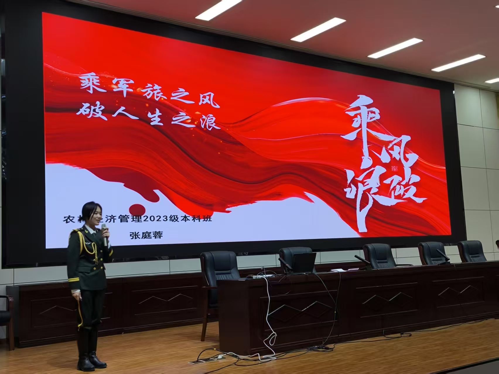 优秀退伍大学生代表代玉成、张庭蓉分享军旅生涯。他们讲述了在部队训练、生活的点滴,从初入军营的不适到蜕变成长,以及对个人意志品质的磨炼,让在场学生深受感染,进一步坚定参军报国的决心。