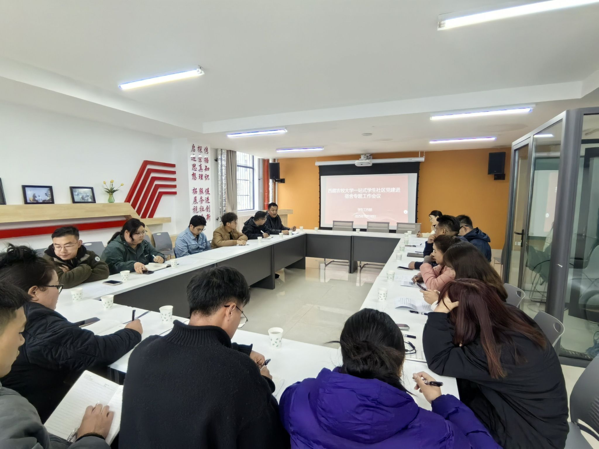 为推进党建进宿舍工作,引导学生积极参与学生社区管理,充分发挥学生党员先锋模范作用,2025年10月30日,学生工作部在“一站式”学生社区知行厅组织召开2025年度党建进宿舍专题工作会议。各学院负责学生党建辅导员、分管宿舍工作辅导员、大学生社区服务中心全体人员、党员工作站站长、楼(层)长代表等参加会议,会议由学生工作部副部长洛桑云旦主持。