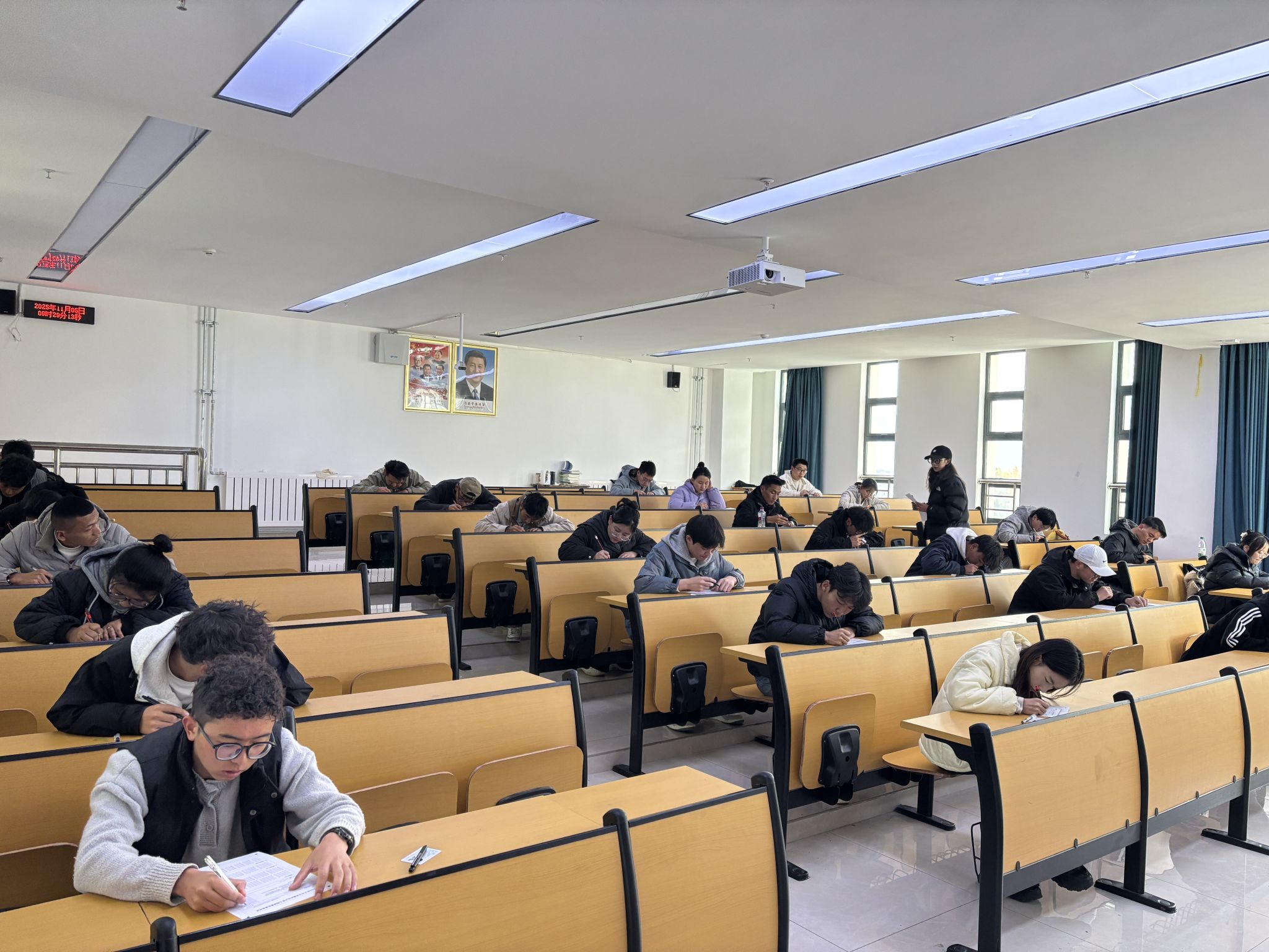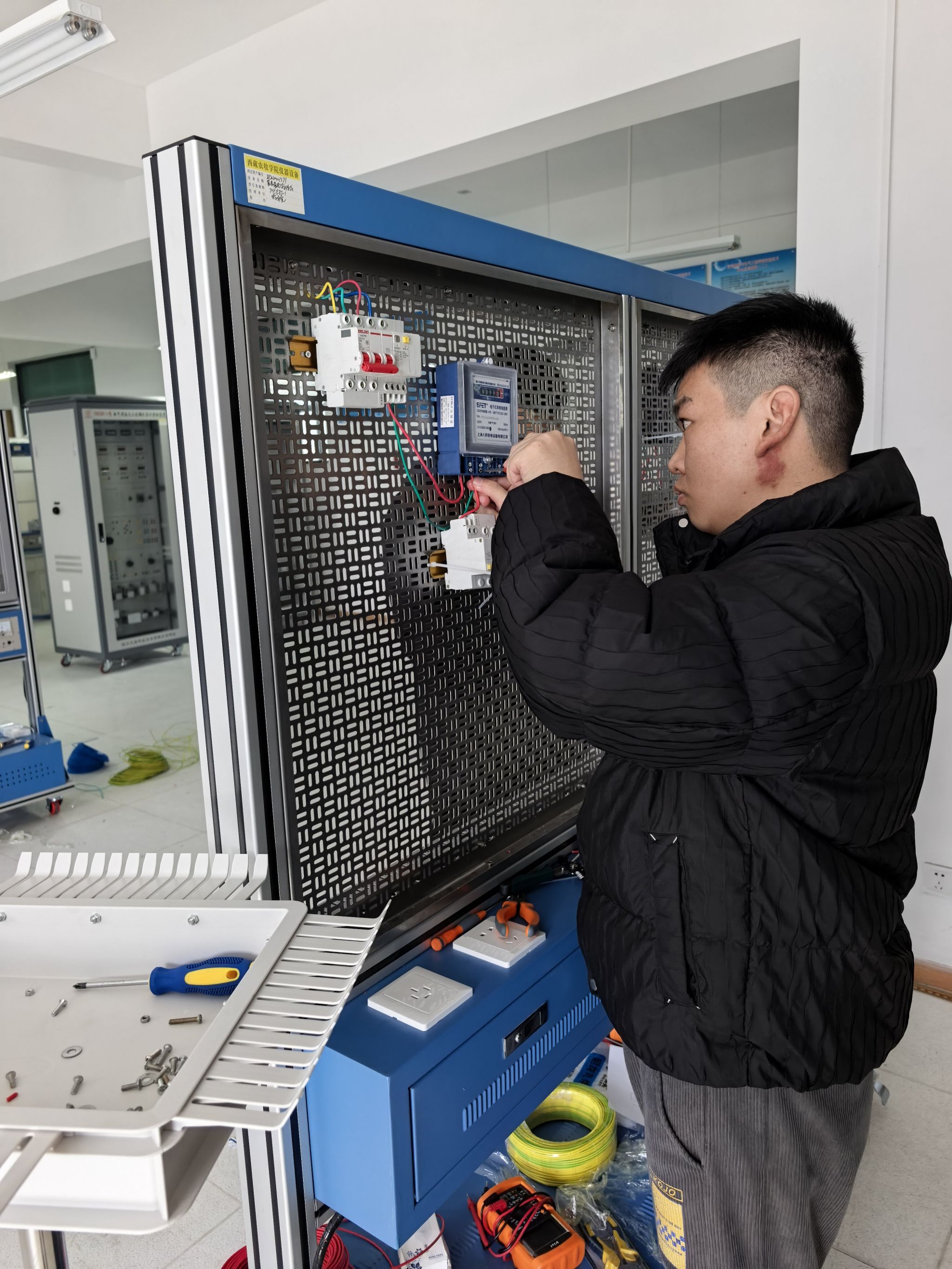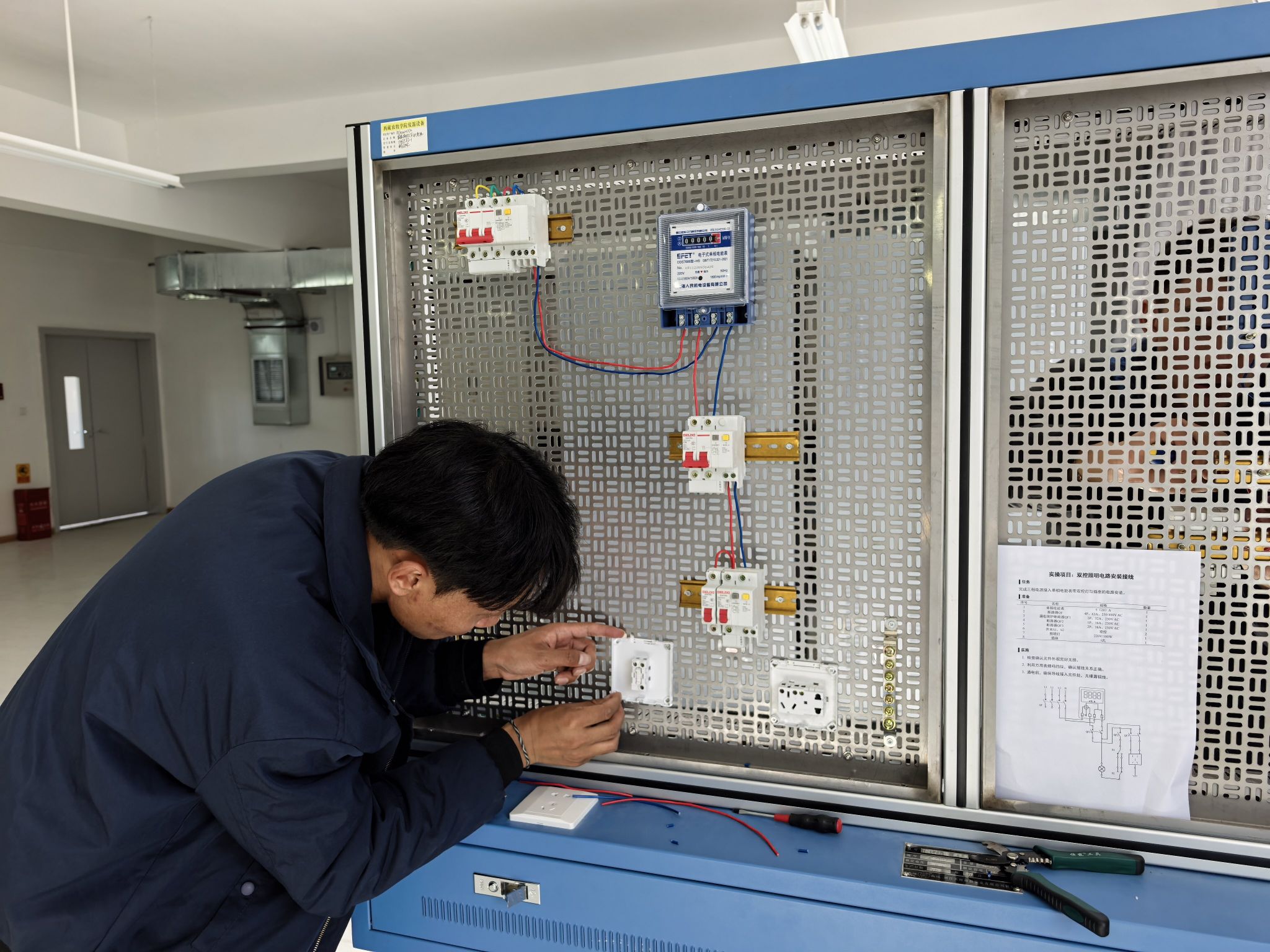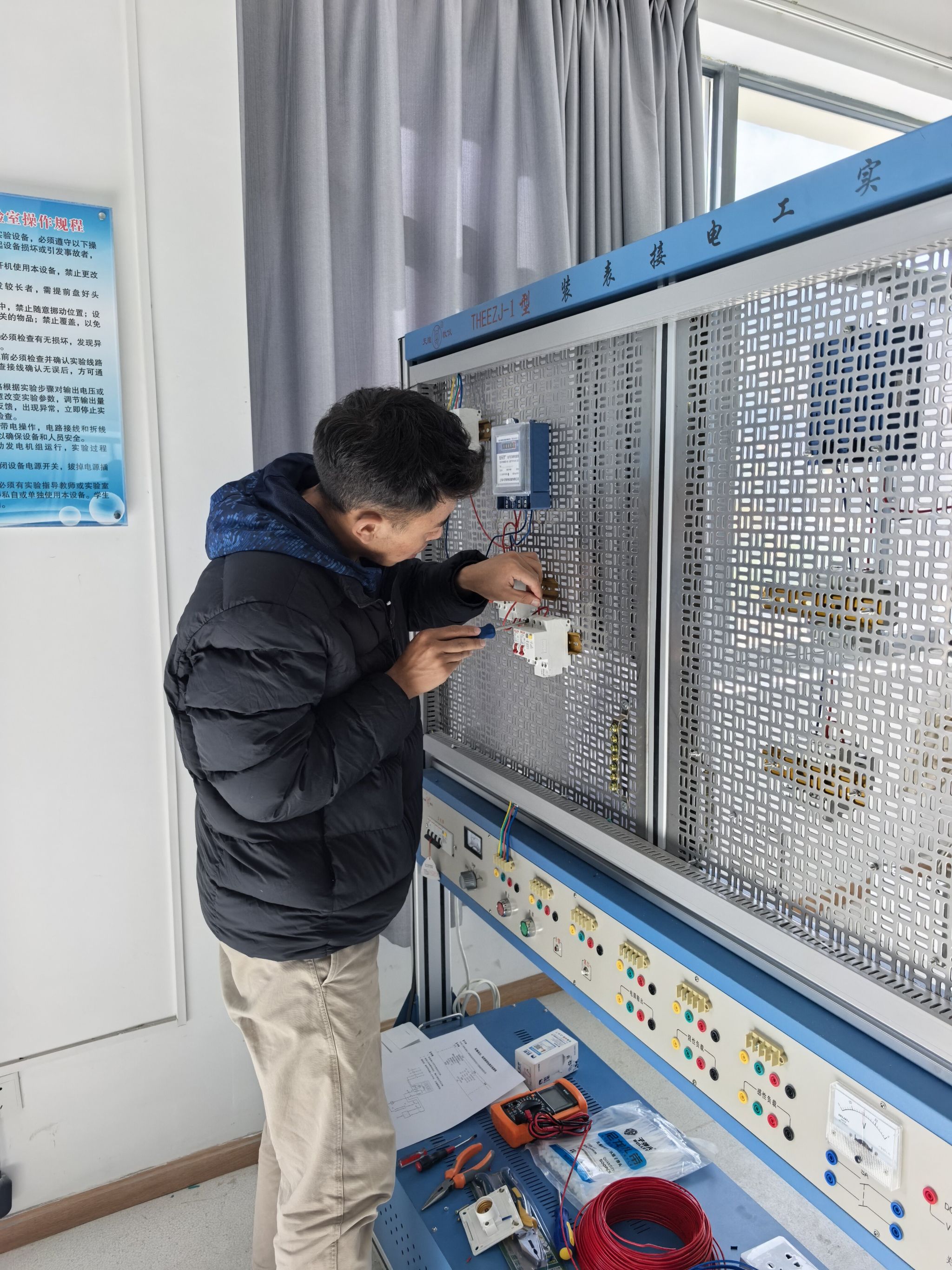 此次技能鉴定严格遵循“理论+实操”双考核模式,考核流程紧凑有序。上午9:30,“工程测量员”、“电工”理论考试在6教举行,考场内秩序井然,考生们满怀对技能认证的热枕投入作答,充分展现出良好的学习素养与备考状态。理论考试结束后,实操考核随即启动,各工种考生按指定地点有序入场:工程测量员实操考核地点设在文体馆广场,聚焦“等外水准测量”核心技能,检验考生仪器操作与数据处理能力;电工实操考核安排在理工楼702室,以“双控照明电路、安装接线”为考核内容,重点测评考生实操规范与安全操作意识。