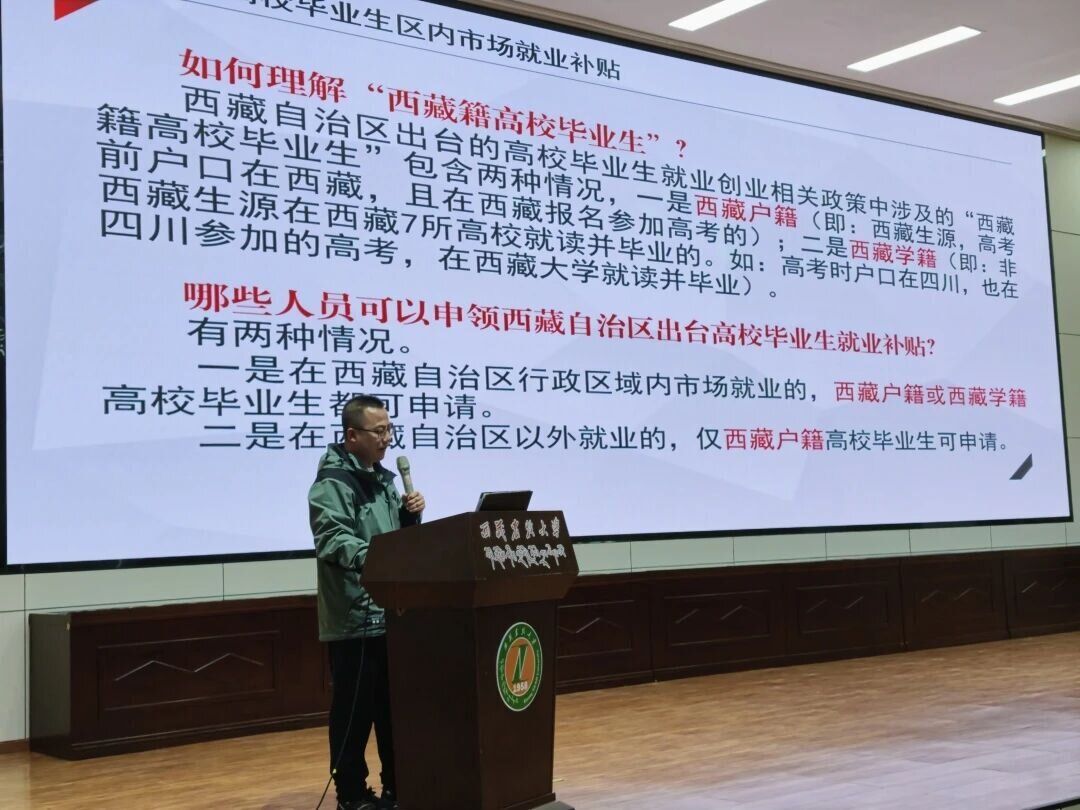 活动现场,付燕等四名宣讲员结合自身创业实践、区外就业经历,分享成长感悟与实战经验,为毕业生提供鲜活就业案例。林芝市人社局邢伟力系统梳理就业创业扶持政策,详细介绍区内就业补贴、自主创业全链条扶持、区外就业林芝专属叠加福利,以及少数民族毕业生专项激励政策,现场同步展示线上申请便捷流程,让同学们 “一站式” 吃透各项优惠政策。