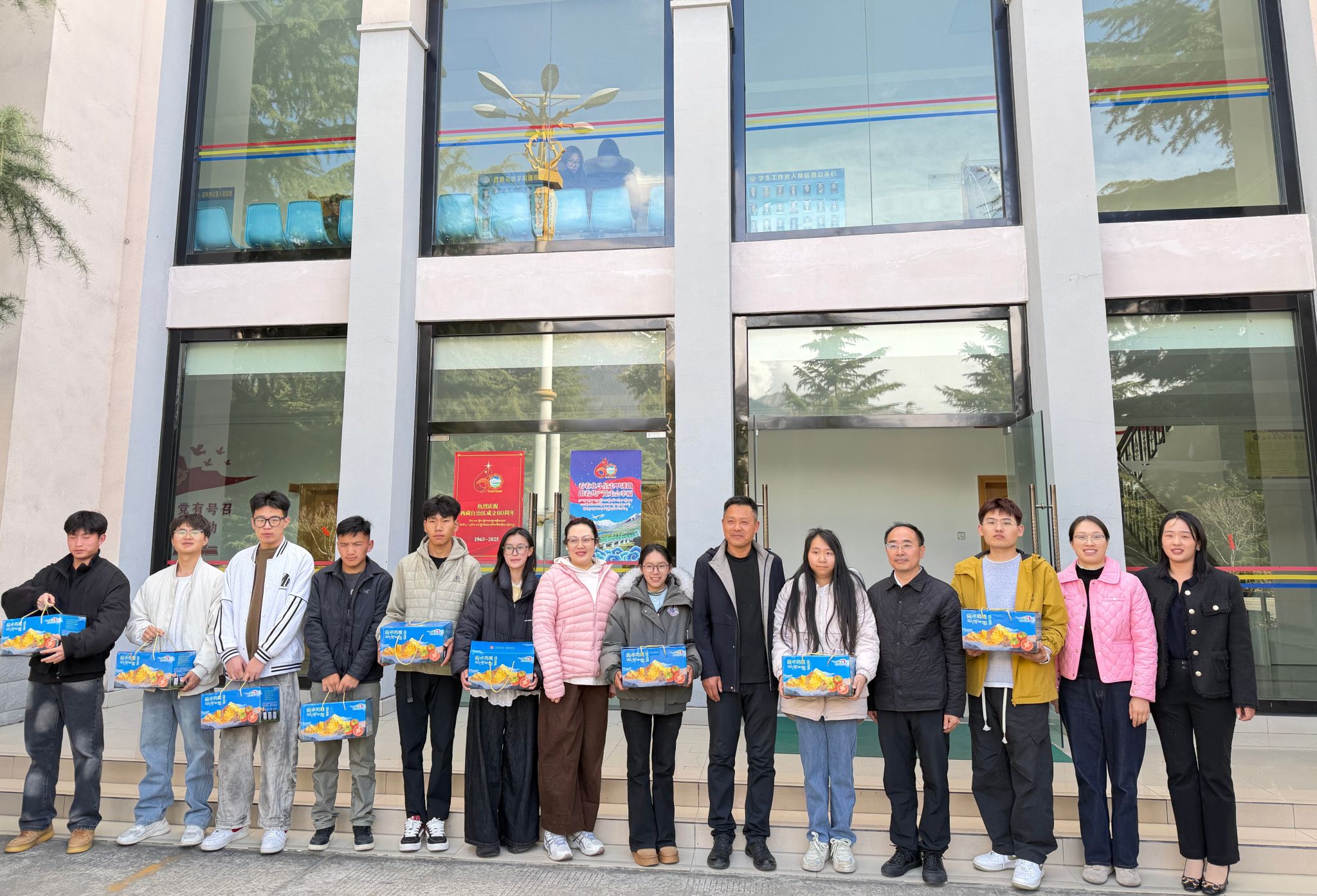 此次林芝藏禾生态农业科技有限公司共捐赠了70份爱心公益礼包。在温暖融洽的氛围中,郭启松先生向9名学生代表现场发放了爱心公益礼包,并合影留念。此次活动不仅为学子们带来了物质上的关怀,更进一步深化了欧博与企业的沟通联动,既搭建了公益助学的暖心桥梁,也为后续校企协同育人、共促学子成长奠定了坚实基础。