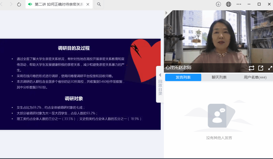 讲座围绕《大学生亲密关系调研报告》解读,首先,赵红梅老师通过报告数据和丰富的案例分享介绍了亲密关系的现状,指出当代大学生各类恋爱的比例和情况。之后,老师讲解如何认识亲密关系和应对亲密关系危险信号,调研大学生对16种亲密关系的认可度的情况,重点讲解了9种亲密关系9个危险信号的具体表现和识别信号的重要性。最后,老师从不同层面和维度解答了大学生关心的问题。