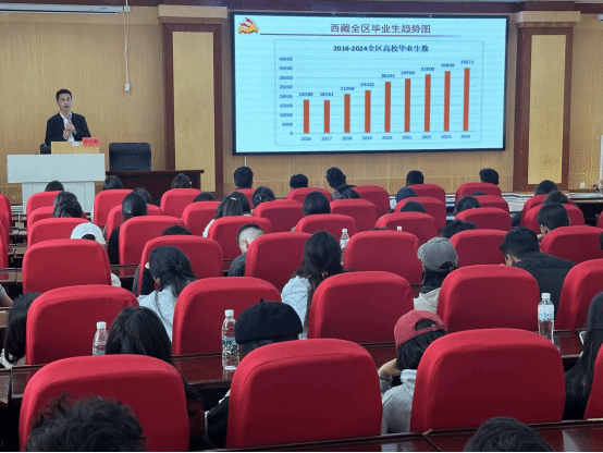 宣讲会上,苏大鹏副书记借助精美直观的PPT讲稿、精心绘制的图文、科学直观的各类数据,以“反思问题、提出建议”的角度,通过数据比对、图文结合、数形呼应、问题清单、解决途径等平铺直叙的讲授方法,从“对自己的能力素质对标不准——增一倍法则,对所学专业就业前景把握不准——回头看法则,对西藏就业趋势研判不准——向前看法则,对全国促就业形势了解不准——向远看法则”四个方面进行了深入阐述和详细讲解,既有全国就业创业总体形势和政策的分析和解读,又有全区就业创业工作面临的形势和面对的压力、特殊的区情和优惠的政策的深度分析与研判,更有结合学校和学院实际情况后具体而详细的把脉问诊,尤其是从近5年以来的学校和学院就业创业趋势与规律,以严谨的逻辑、清晰的脉络、缜密的思维、务实的建议深入客观分析当前我们面临的就业形势与就业压力,教育和引导全体毕业生牢固树立“先就业、后择业”的观念,鼓励大家积极转变自己和家长的就业观念,同时要求学院和老师们也要转变就业观念,倡导毕业生积极参与各类就业招聘活动,勇于开拓创新创业之路,争取早就业、稳就业。