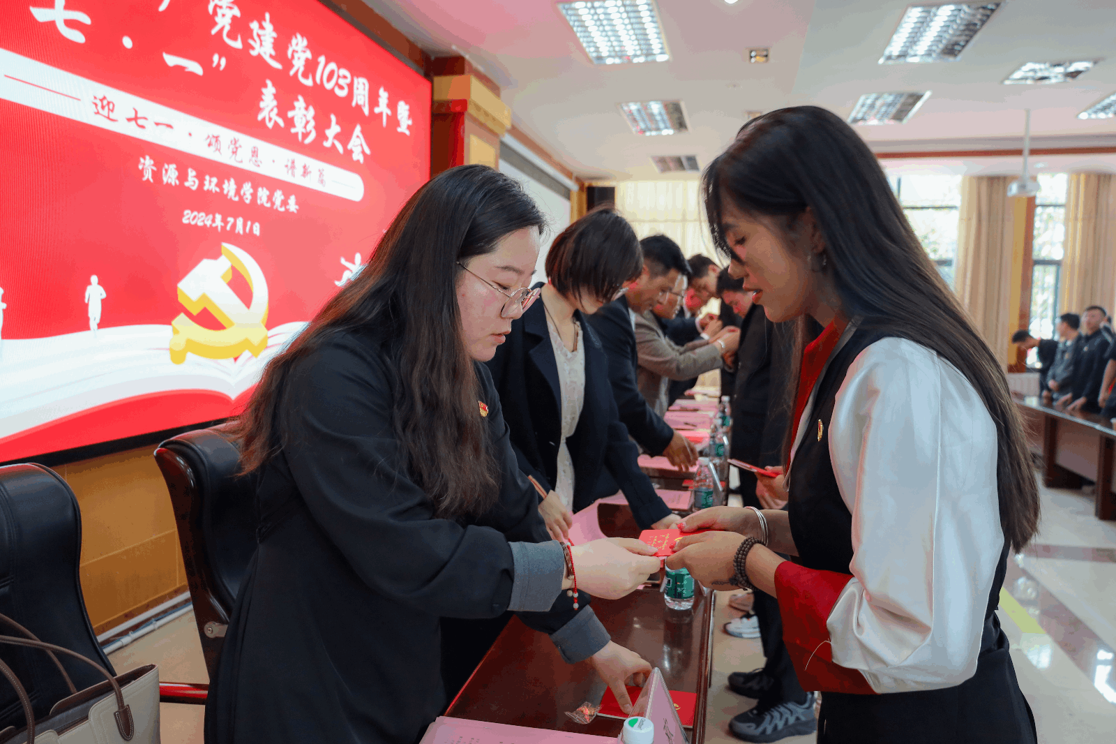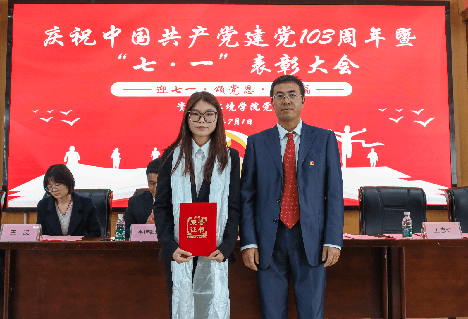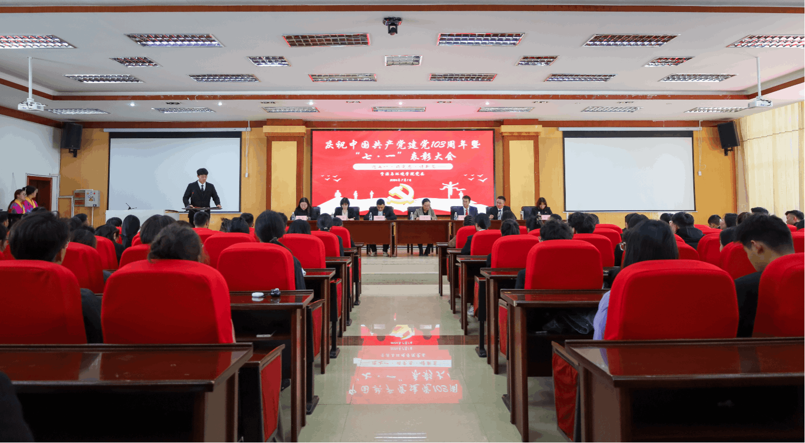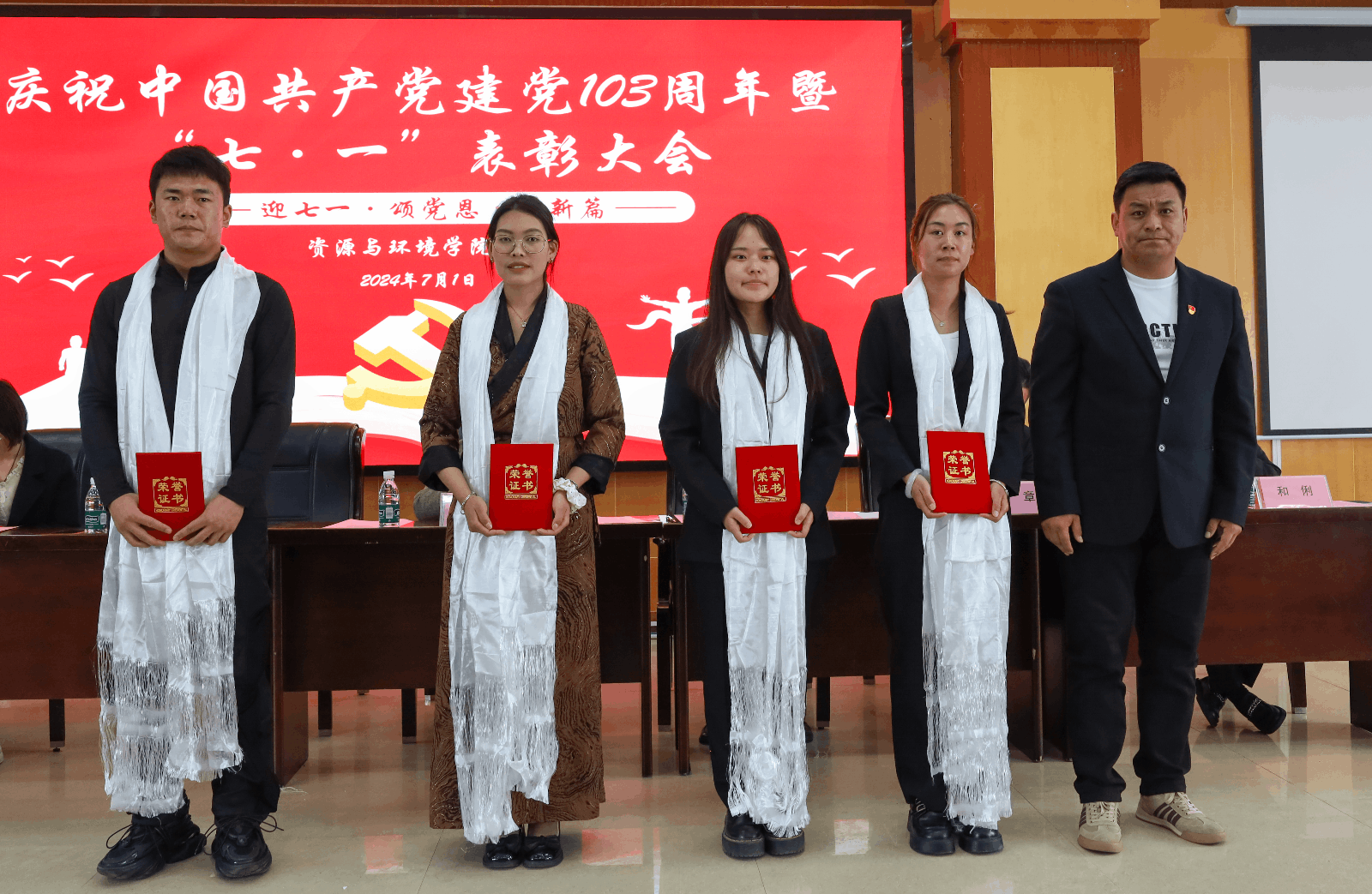 为庆祝建党103周年,深入贯彻习近平新时代中国特色社会主义思想,进一步加强党纪学习教育,充分发挥先进典型的示范引领作用,营造创先争优的浓厚氛围,激励学院各党支部和广大党员见贤思齐、奋发进取。7月1日下午5点,学院党委于研究生苑1号报告厅召开庆祝中国共产党建党103周年暨“七·一”表彰大会,学院党委书记次仁吉,党委委员副院长王忠红,各学生党支部书记、全体学生党员参会。