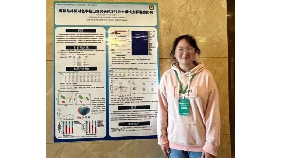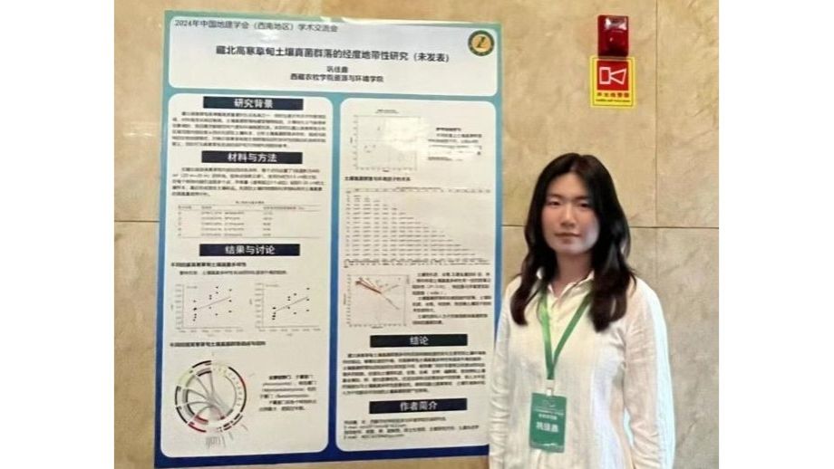 会议以“世界屋脊资源与环境变化,青藏高原绿色高质量发展”为主题,围绕地表过程变化与生态保护、区域绿色发展与乡村全面振兴、全球气候变化与冰冻圈保护等议题进行研讨。相关领域知名科学家作特邀主旨报告。在研究生分会场,资源与环境学院侯磊副教授指导的2023级研究生高宛宛、巩佳鑫分别作了题为《海拔与林隙对色季拉山急尖长苞冷杉林土壤线虫群落的影响》的学术报告和题为《藏北高寒草甸土壤真菌群落的经度地带性研究》的墙报,从自然地理学角度探讨了西藏高原的土壤生物地理分布。