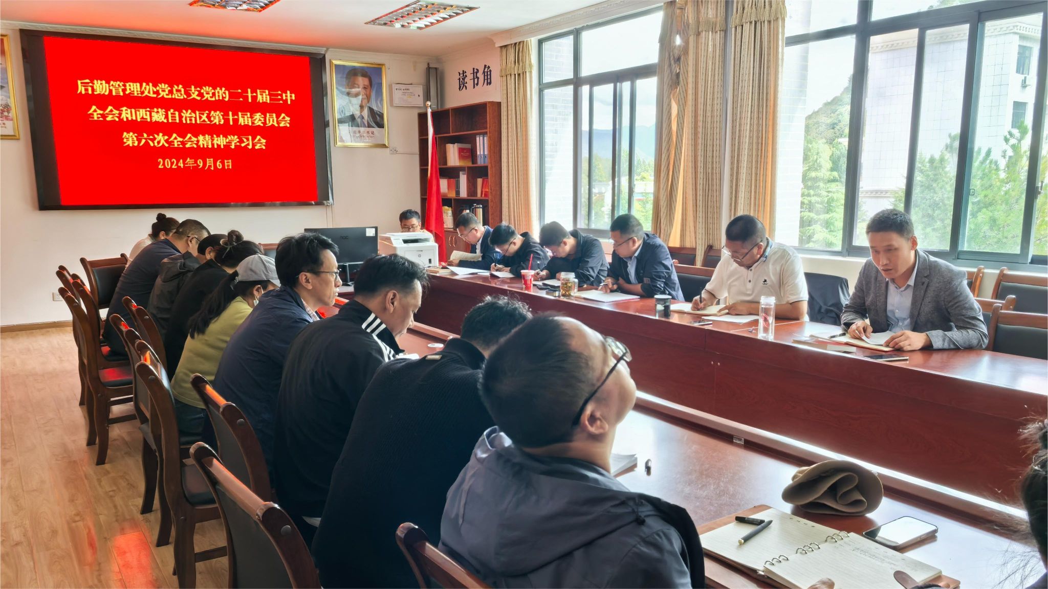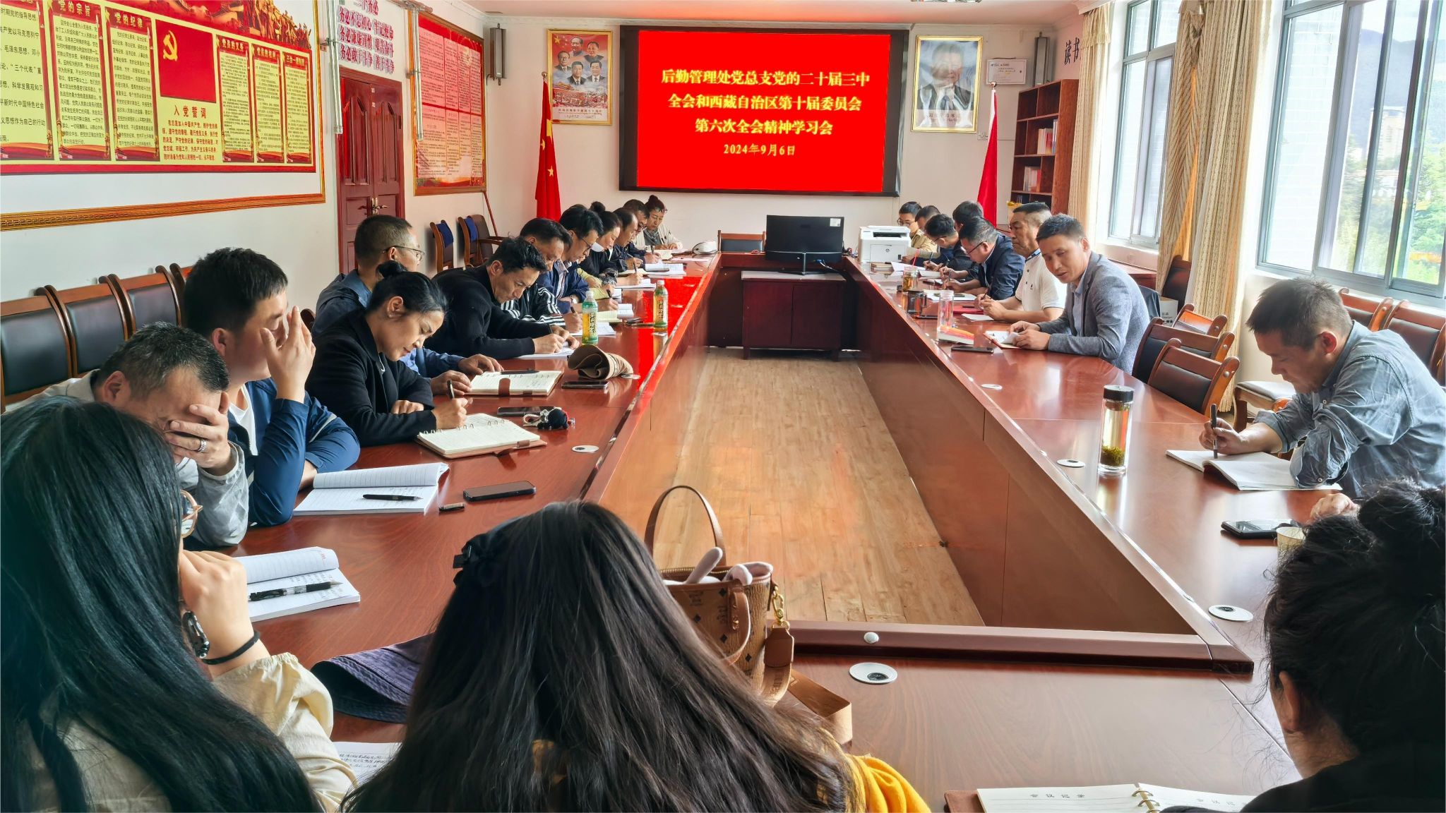 为深入学习贯彻党的二十届三中全会和自治区党委第十届委员会第六次全会精神,进一步统一思想、凝聚力量,提升后勤处全体党员干部的政治理论素养和业务能力,2024年9月6日下午,后勤管理处党总支组织召开了党的二十届三中全会和中国共产党西藏自治区第十届委员会第六次全会精神专题学习会。会议由后勤管理处党总支书记普穷同志主持,后勤管理处党总支班子成员、全处职工参加了此次学习。