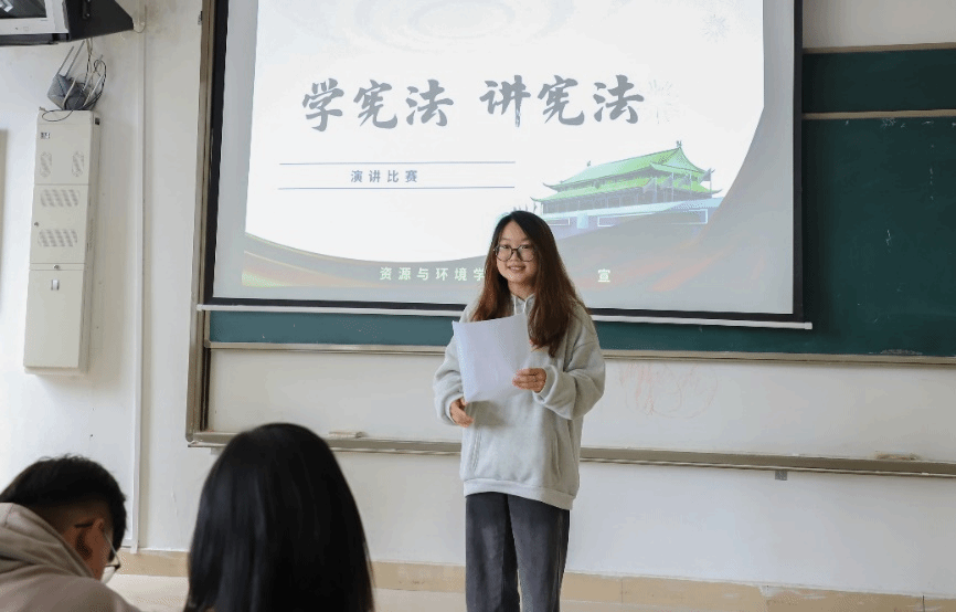 为全面学习贯彻党的二十大精神,大力推进爱国主义教育与宪法法治教育相结合,扎实推动青少年宪法学习宣传教育常态化长效化,增强我院学子宪法意识和法治观念,促进我院学子知法、懂法、学法、用法、守法,更好地发挥宪法在法治校园建设、法治社会建设以及治国理政中的重要作用,资源与环境学院在2024年9月6日于第三教学楼3201教室开展“学宪法 讲宪法”主题演讲比赛,资源与环境学院学生积极参加。