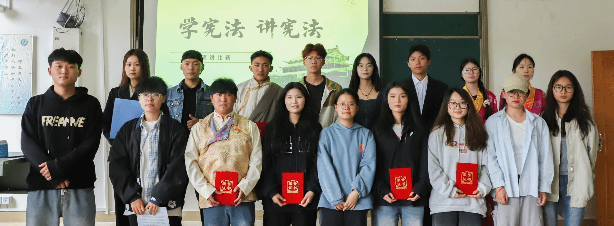 活动伊始,由工作人员组织参赛选手抽签决定比赛顺序,主持人宣读比赛规则并宣布比赛开始。演讲环节,选手们以“学宪法 讲宪法”为主题,围绕青藏高原生态保护法、反食品浪费法、节约能源法、禁毒法、网络安全法等相关内容展开演讲,或慷慨激昂,或娓娓道来,从不同角度阐述自己对法律知识的认识与理解,呼吁同学们共同努力,为构建自由、平等、公正、法治的社会作出贡献!演讲结束后,评委李伟国就参赛选手演讲的内容和表现进行细致地点评,他鼓励选手们应该结合时事,创新内容,强化内涵,让演讲更加振奋人心,让宪法更加深入人心。现场评委秉承着公平、公正、公开的原则,评选出一等奖一名,二等奖两名,三等奖三名并为其颁发证书。此次“学宪法 讲宪法”主题演讲比赛圆满结束。