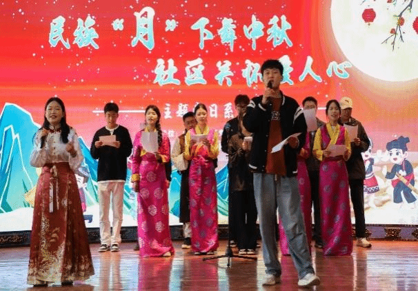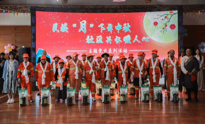 活动第一项,各队伍参与文艺竞演,以舞蹈、朗诵和歌唱的形式展现队伍风采,演出期间还特别设置民族团结知识问答环节,增加互动性和趣味性,现场评委选出三支优胜队伍和竞答成功者为其颁发精美奖品。活动第二项,慰问老党员,倾听他们的故事,关心他们的生活状况,学习革命精神。活动最后一项,向社区老一辈传递社区的关怀和温暖,献哈达,赠送大米、清油、月饼等,表达尊重与关怀。