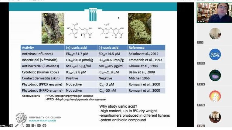 在交流探讨环节,侯磊老师围绕地衣生物化学在不同地区的差异、地衣分类学问题以及化学生态学等角度与徐老师展开深入探讨,王芳老师则从西藏松萝的药用价值开发利用、松萝分类学特征以及松萝酸目前的应用现状及前景等方面提出问题,徐老师一一耐心解答,为老师们了解相关研究方向提供了帮助。