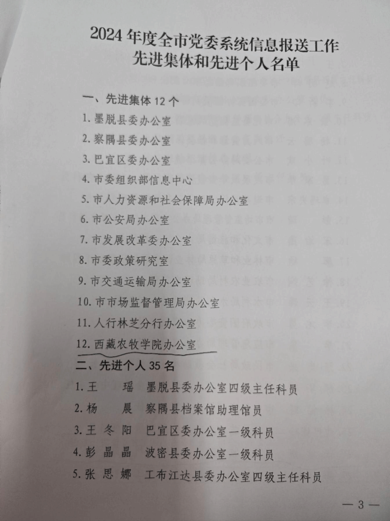 日前,根据《中共林芝市委员会办公室关于通报表扬2024年度全市党委系统信息报送工作先进集体和先进个人的通知》(林委办〔2025〕9号),校办公室荣获“2024年度林芝市党委系统信息报送工作先进集体”称号,校办公室秘书科张彦妍同志荣获“信息报送工作先进个人”称号。