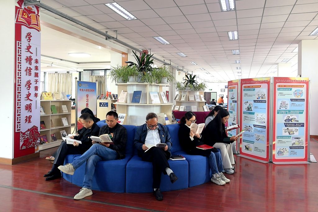 沉浸式阅读,汲取奋进力量。为深化理论学习,支部在图书馆二楼设立“党员学习专区”,精心挑选党章、党规、党史、党纪等相关主题书籍,打造了良好的学习阵地。在“沉浸式阅读”环节,全体党员认真挑选感兴趣的书籍,专注阅读 30 分钟。