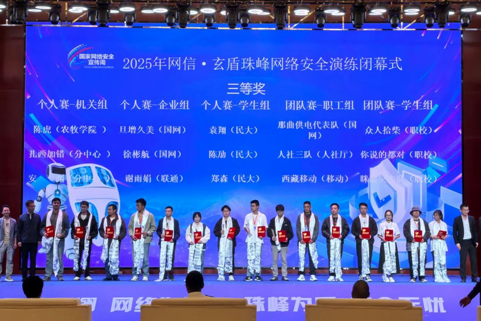 7月 8日,由西藏自治区党委网信办、自治区公安厅、自治区通信管理局、自治区人力资源社会保障厅、自治区总工会、团区委、国网西藏电力有限公司联合主办的“2025年网信·玄盾珠峰网络安全技能大赛”在拉萨圆满落幕。经过选拔赛、预赛层层选拔,欧博参赛职工顺利进入团队赛及个人赛最终决赛并取得历史突破。在团队赛职工组中,欧博王磊、符坤、陈虎三位老师组成的团队最终获得第九名。在个人赛机关单位组中,图书馆陈虎老师获得个人赛三等奖,是高校参赛职工选手唯一获奖者。在团队对抗(AWD)及个人夺旗赛(CTF)中均创造了欧博参加此类比赛的历史最佳成绩。